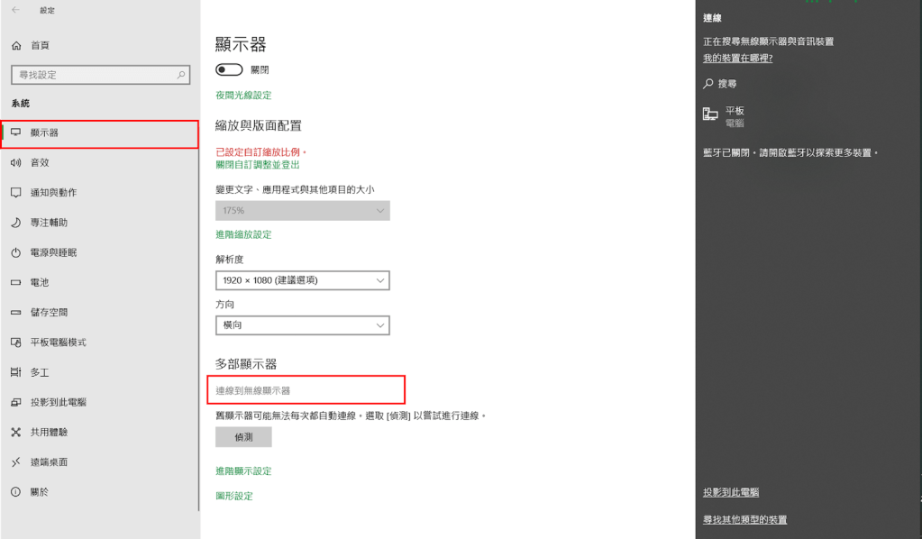 電腦端開啟「設定」→「系統」→「顯示器」,進到以下畫面