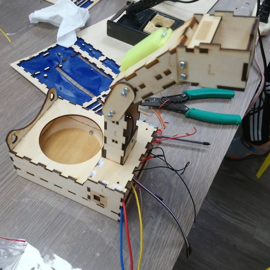 早上三小時,全部的時間都花在外殼的大部組裝,組裝的過程需要用到焊槍將線材旱在一起,也需要用白膠將雷切板材組裝,過程中滿手都是白膠就忘記拍自己組裝的照片了。