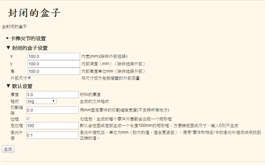 最近想用雷雕機來切些架子來組裝,但苦無設計卡榫的快速方法,畫了一些圖改了又改總是不好看,最後上網又google,沒想到竟然讓我找到了這個超及方便的網站Boxes.py