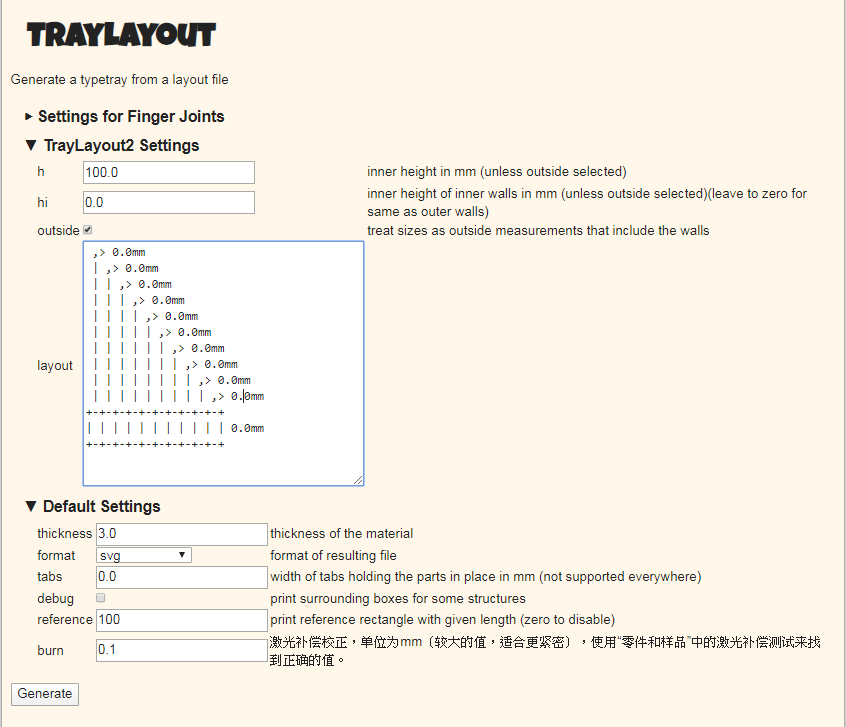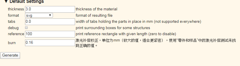 最後的雷切設定中我的木板材是3.0mm的,並且經過測試後,激光補償這欄設定為0.16可以讓切割完的板材有最佳得密合度,最後format選擇svg檔案,就可以按下「Generate」。