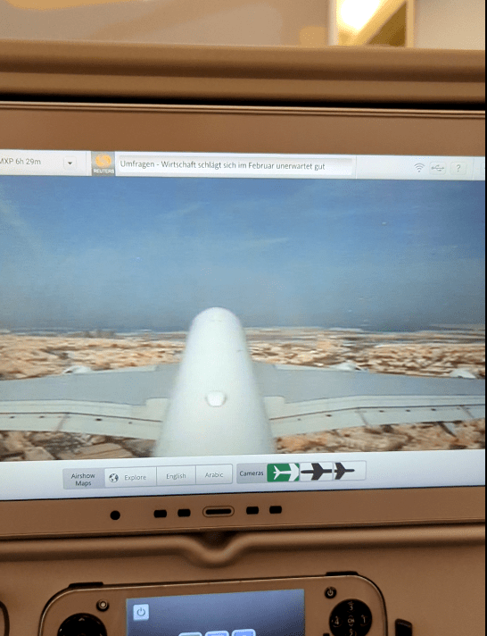杜拜往返羅馬為A380,螢幕解析度看起來比較高,而且觸控也靈敏很多,下方的遙控看起來較高級。照片這個位置是走道旁,左側的USB孔推斷是提供多媒體傳輸用的,充電很慢。