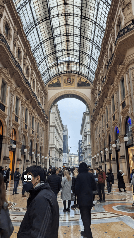 艾曼紐二世是義大利統一後第一個國王的名字,後續也在好幾個地方看到這個國王的雕像,拱廊建築搭配玻璃與鑄鐵鋼材的屋頂,牆邊精美的雕刻以及宗教色彩的圖像,對於甫來義大利的我們而言,震撼到不行。一步入迴廊,馬上感受到這金碧輝煌的氣魄,除了建築物很漂亮外,精品店林立也是吸引觀光客前來的主要原因,看著遊客手上一袋袋精品,雖然感到羨慕,但能站在這裡體驗貴婦的視野我已經很知足了。團友也分享這邊的貨算齊全,有需求的朋友,看到就下手不要遲疑,因為後面的店不一定會有你想要的,義大利結帳速度慢,跟團的務必要注意提前結帳,避免影響團體行程。