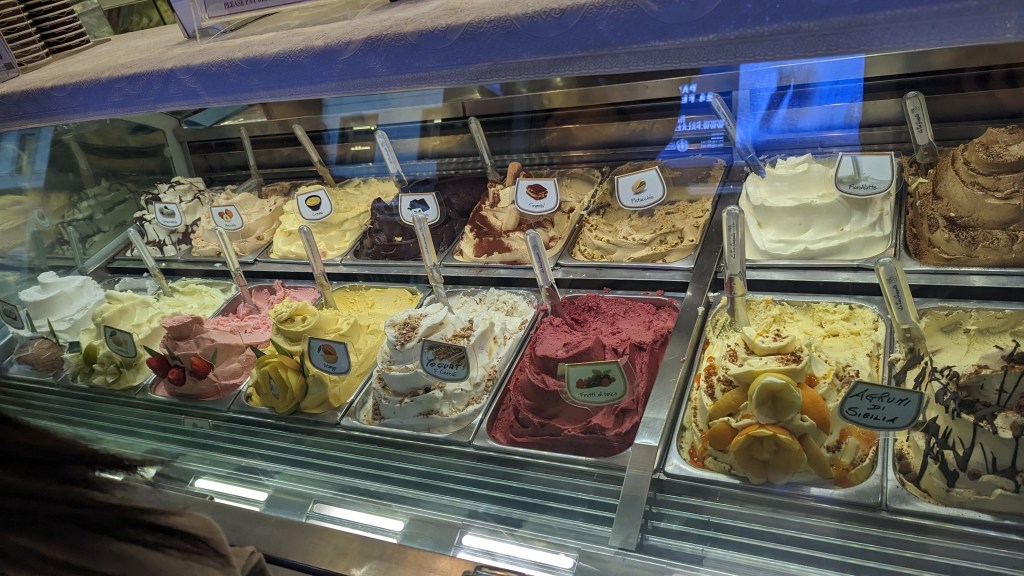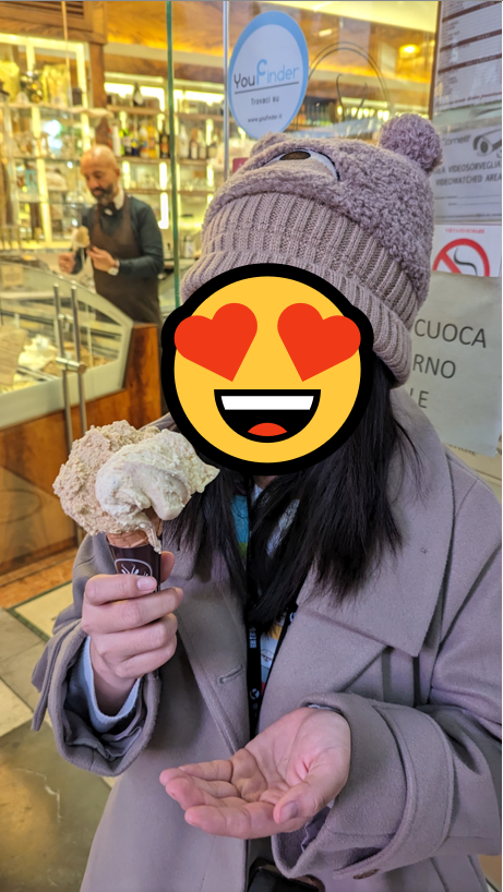 自由時間第一站,我們直接飛奔冰淇淋,當天來到門口遇到好幾位韓國人跟我們一樣不知道該怎麼點餐,詢問後才知道要走進店裡靠右有結帳櫃台(靠左是吧檯),比了價目表上的冰淇淋後,與店員結帳拿單子再到店外櫥窗去選冰淇淋口味,我們點兩球4歐元,選了開心果(pistacchio,我唸匹斯塔可唷)和提拉米蘇口味,略有冰沙的口感,對我來說稍甜,但不會膩口。義大利的冰淇淋使用天然食材,不用色素與過多添加劑,所以我每天都至少吃一支冰淇淋。
