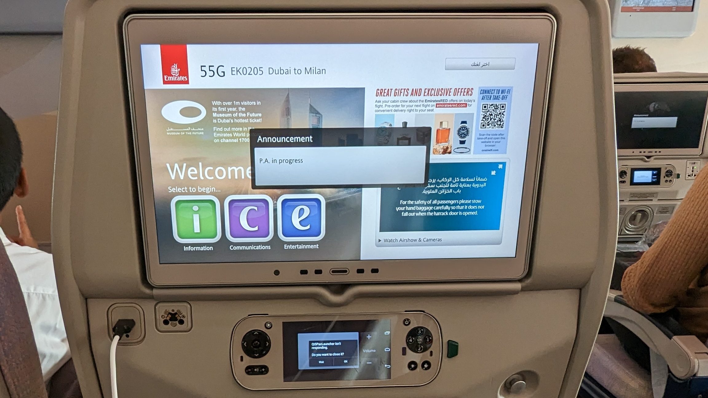台北到杜拜約9小時50分(供兩餐),杜拜停留4.5小時(供一餐+點心),杜拜到米蘭約7小時,光通勤就耗費22小時。朋友說阿聯酋是國際知名航空,要我好好體驗,臺北到杜拜是777座位空間並不大,可能還比國光客運座位還窄,杜拜到米蘭是A380,伴侶表示這班坐位較寬敞,不過這兩班手都很容易揮到隔壁,商務艙可能就沒有這個困擾XD。空服員服務態度佳,電影、音樂選擇豐富(哈利波特有中文字幕,來回剛好可以看完全集,另外還有捍衛戰士跟黑亞當等較新的電影),靠走道的位置沒有插座,疑似只有USB連接孔,充電速度極慢;中間座位的插座實測充電速度一般。有提供過夜包(眼罩、牙膏牙刷、襪子)、餐食、喝到飽的飲料與酒,非餐期若肚子餓可以要求泡麵,但餐點分量其實蠻多的,再點泡麵可能會吃不下,除了主食還會有麵包與點心,因為是國外航空,口味偏西式,較不合我胃口,所以我幾乎都丟給伴侶吃。在杜拜等候轉機時,領隊即時通知機票超賣19席,要我們趕緊去排隊,幸好最後整團都有登機,大家務必提前去登機門等候,畢竟世事難料。