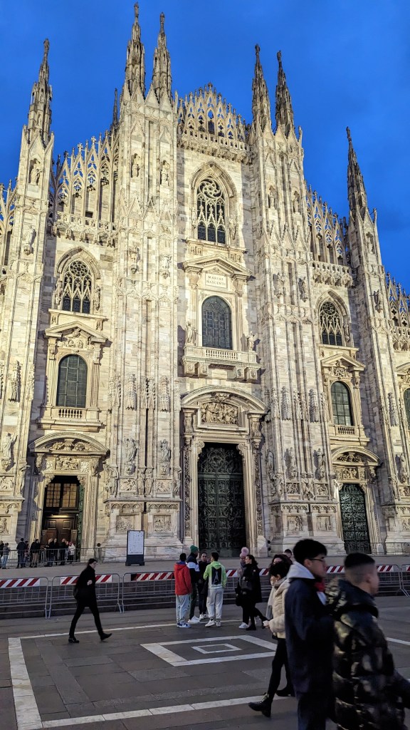 教堂需用廣角鏡頭才有辦法整座入鏡,如果時間允許,可提前訂票登頂(網址:https://ticket.duomomilano.it),登頂時間務必先與領隊確認,建議選電梯登頂效率最高,晚上教堂會點燈也很漂亮。因我們有其他行程,並沒有登頂,我們團友有去,他們覺得很美很值得,時間允許一定要安排,而且是少數可以坐電梯上登頂的。