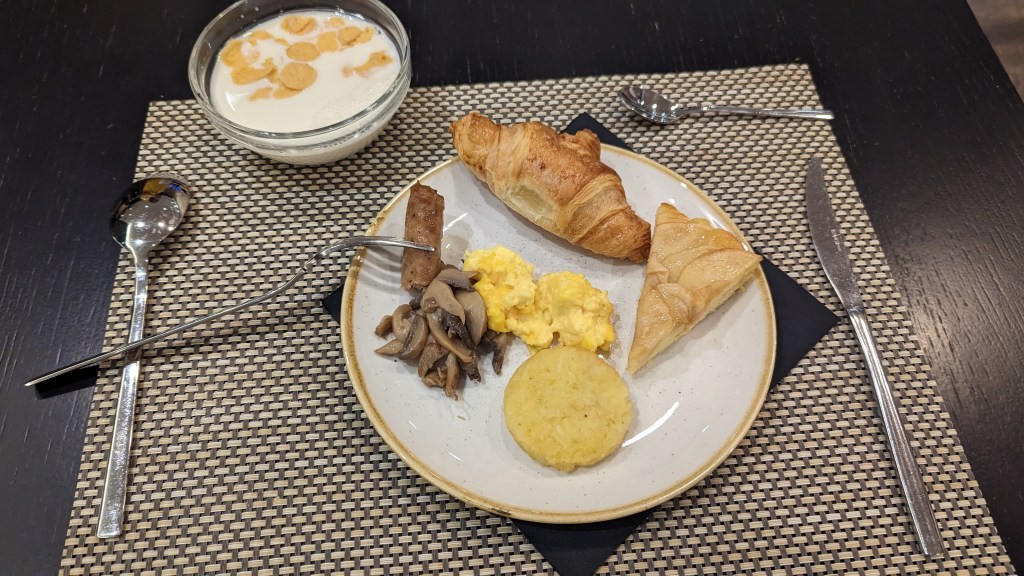 好險飯店鄰近機場,這間飯店早餐5點半就開放了,像安海瑟威的空姐在我們旁邊吃早餐,滋潤了我們的雙眼,撫平了方才受到驚嚇的心。義大利的早餐較為簡便,大致上就是可頌、麵包、果醬、咖啡、麥片、牛奶,高級一點的還會有各種餅乾、麵包、起司、醃漬火腿或肉片、鳳梨水果,熱食永遠都是熱狗、炒蛋兩種,只有在最後兩天看見炒野菇、蔬菜。吃到後來都產生永和豆漿、美而美和清粥小菜的幻覺,所以後續針對早餐不會特別敘述,合先敘明。
