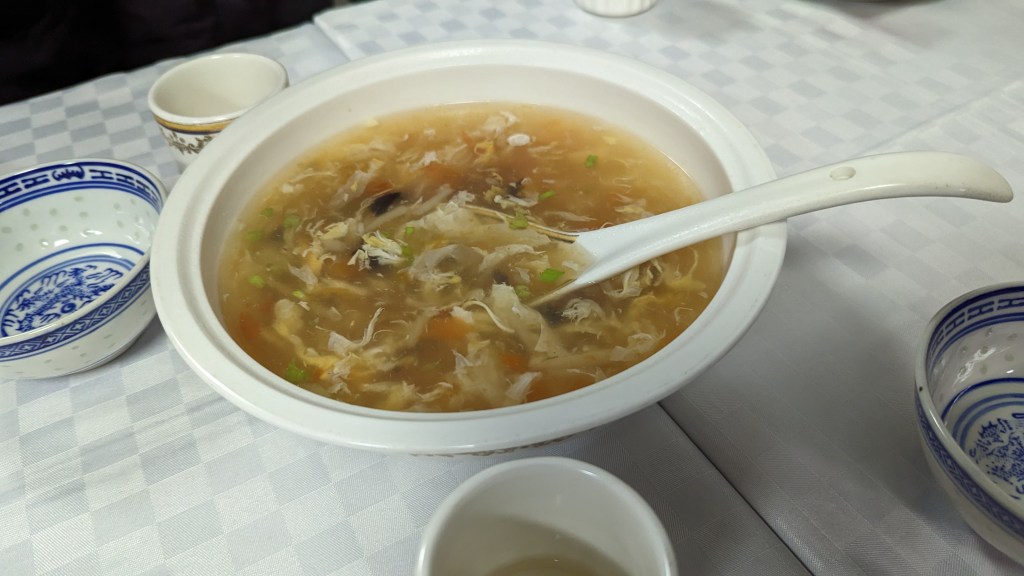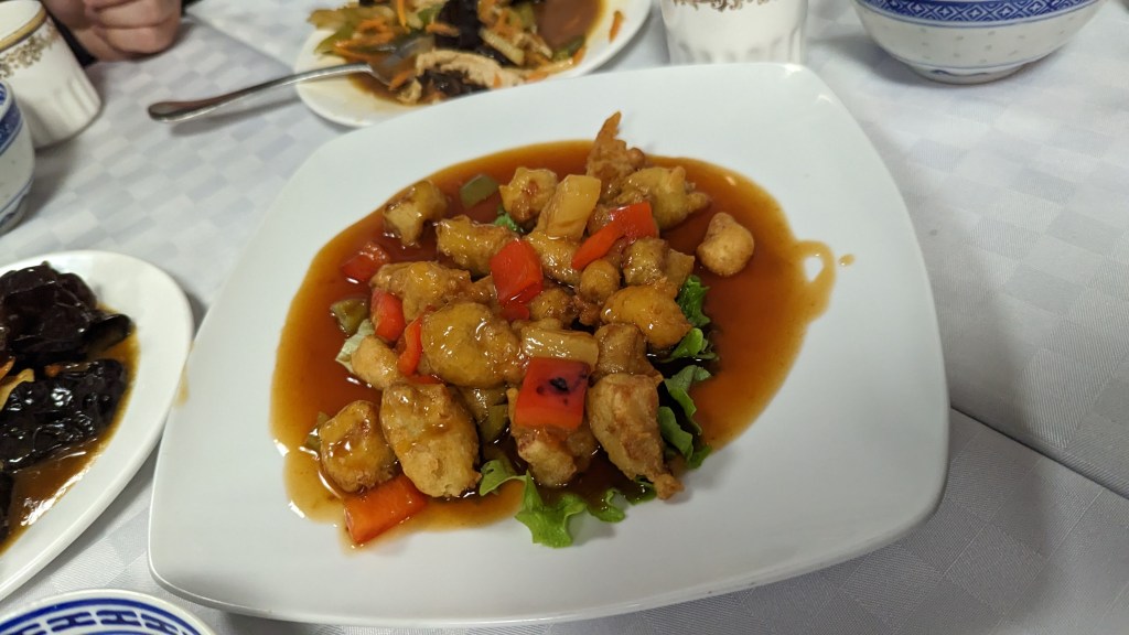 四人一桌,一鍋飯、勾芡有鹹味的熱湯(裡頭有蛋花和幾顆豆子),黑木耳炒雞柳、糖醋魚、京醬肉絲、炒青菜(又苦又爛),飯後水果鳳梨。等超久才上菜,還有一桌散客氣到直接離開,因我沒有看菜單,所以只能從樣子去猜菜名,看似像中菜,但吃起來都沒有很到味,聽我們領隊說,遊覽車司機是南義人,直呼不習慣華人飲食,我那時只想大喊,這不是中菜啊啊啊!畢竟我才剛從台灣過來,當時覺得菜色不及格,還碎念到不行,簡直不知人間疾苦,如果這間餐廳擺在後面,不管端出什麼,只要是熱的,我應該都會滿懷感恩。