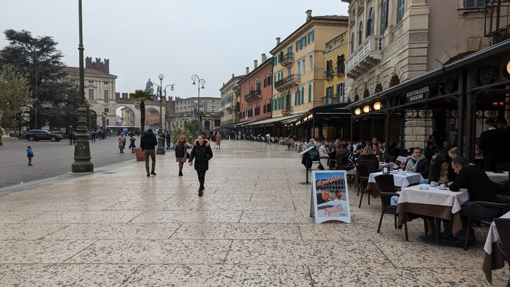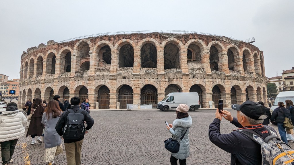 當天有許多學生戶外教學,人潮算多。導覽了維娜諾競技場外部、講解附近市政廳的歷史以及羅密歐與茱麗葉淒美的愛情故事後,便引我們至茱麗葉銅像面前解散自由活動,據說摸右乳有情人終成眷屬,我和伴侶不免俗也向前摸和拍照,茱麗葉的右乳已被摸得發亮。在義大利我覺得很有趣的一點是,景點拍照沒有在講排隊或什麼動線,就大家擠成一團,誰先上去就先拍,本來以為會很亂,結果大家意外的很有默契和秩序,挺好玩的。(題外話,小編寫文章時發現中文的茱麗葉故居地點google map有標錯,要搜尋英文才對喔!)。
