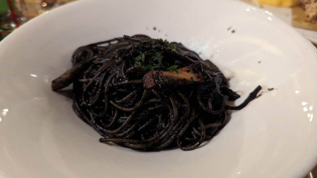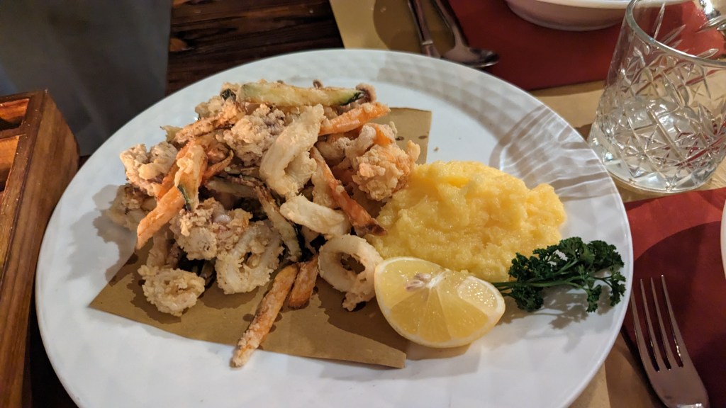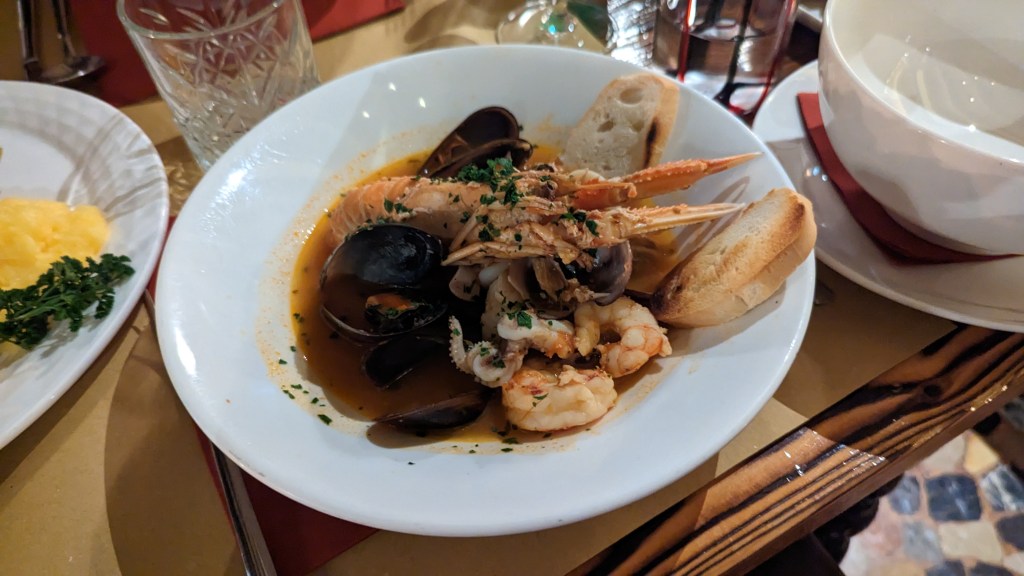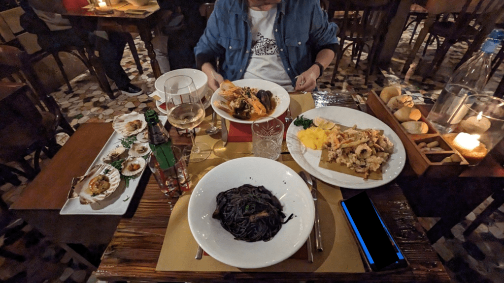 這間評論還不錯,在地人也會去吃,那天晚上只有6度,我超級想喝熱湯,又不想踩雷,我就點了zuppa di pesce(魚湯)、cappesante(烤扇貝)、misto cicchetti(混合開胃菜,為當地小吃)、墨魚麵(spaghetti nerd di seppia)、炸蝦與炸魷魚(frittura scampie calamari)、另外點了白酒和檸檬汽水,共計112歐元。