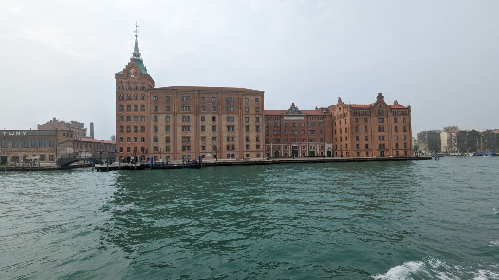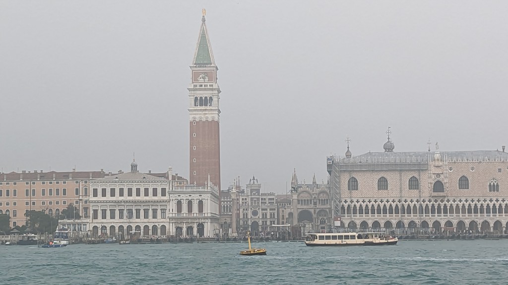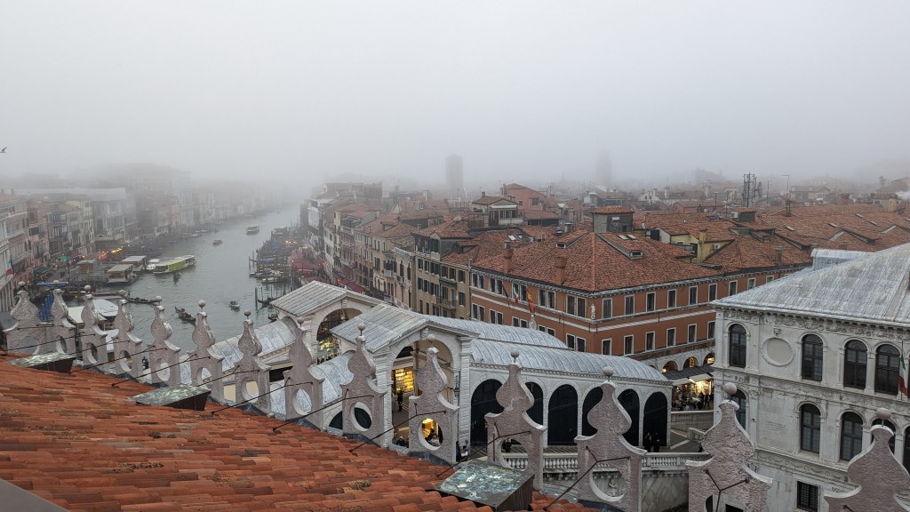 自彩色島搭船到威尼斯便開始起霧,依稀看得到威尼斯其他小島上的建築物,但解析度像你近視500度,拿下眼鏡看四周的感覺一樣,模模糊糊,好像有又好像沒有,船是開放空間,沒有暖氣,2月的海風就吹得我頭皮發麻,建議冬季來毛帽、手套、外套保暖一定要做足。