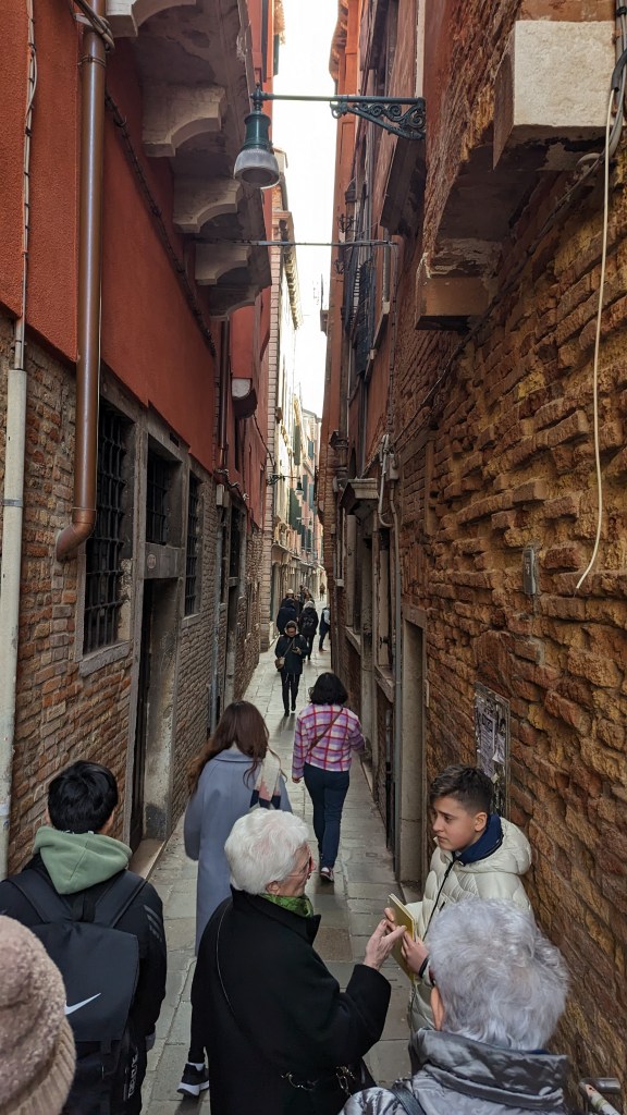 踏入威尼斯本島後,迎接我們的導遊是長年居住在義大利的台灣人,因為已經近中午時間,導遊及領隊先帶我們進今晚的飯店寄放行李,再走去吃午餐,不然手上大包小包在狹窄的威尼斯道路導覽很不方便,沿路小巷堪比鹿港小鎮錯綜複雜彎彎繞繞,真擔心晚上自由時間會不會迷路阿。
