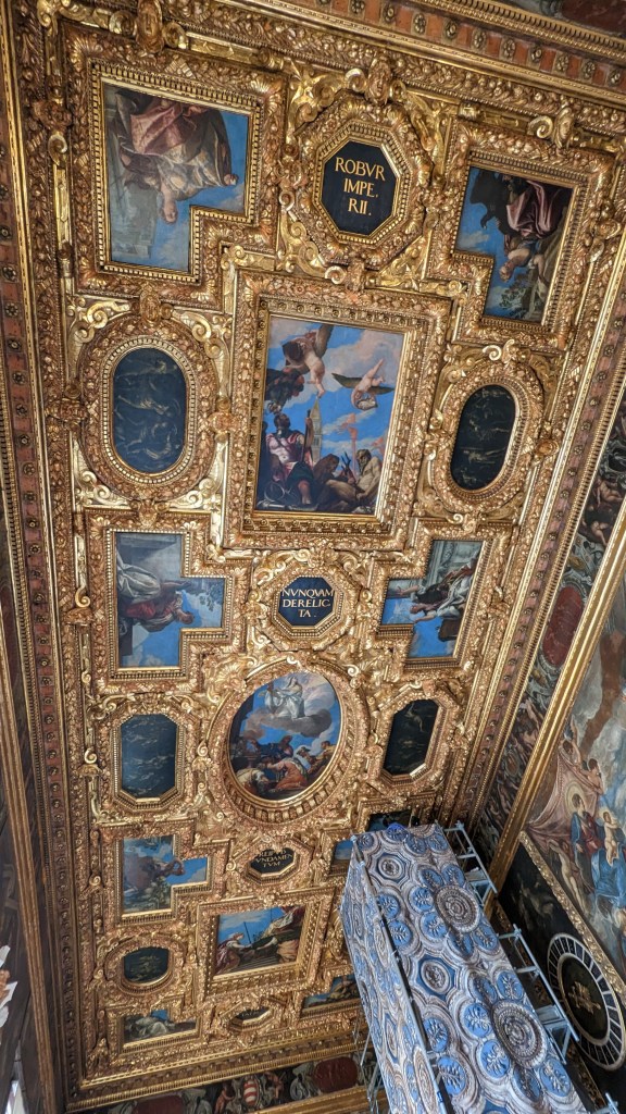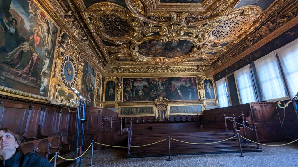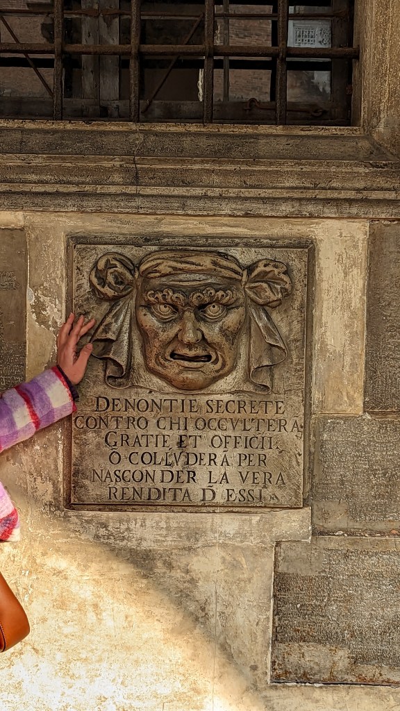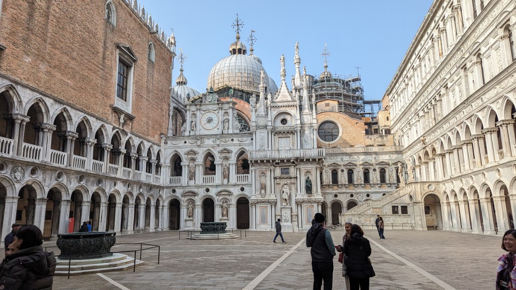 午餐吃完,導遊就領著我們走去導覽道奇宮,道奇宮就堪比國王皇宮的地位,沿路也跟我們講述著威尼斯各個著名景點的歷史文化,個人認為道奇宮值得入內參觀,裡頭的作品非常生動,感覺晚上會自己動和對話XD,還能一探他們的監獄,走嘆息橋體驗罪犯受審判的感受。但義大利博物館的語音導覽似乎都沒有中文,我們是跟團才有中文的服務,如果英文夠好的人就不用擔心,勇敢買票吧!威尼斯到處都可以看到雕像,每個街道都像是電影畫面,古老又充滿神祕的感覺,不時會聽見各地的鐘聲迴響在空中,非常浪漫愜意。