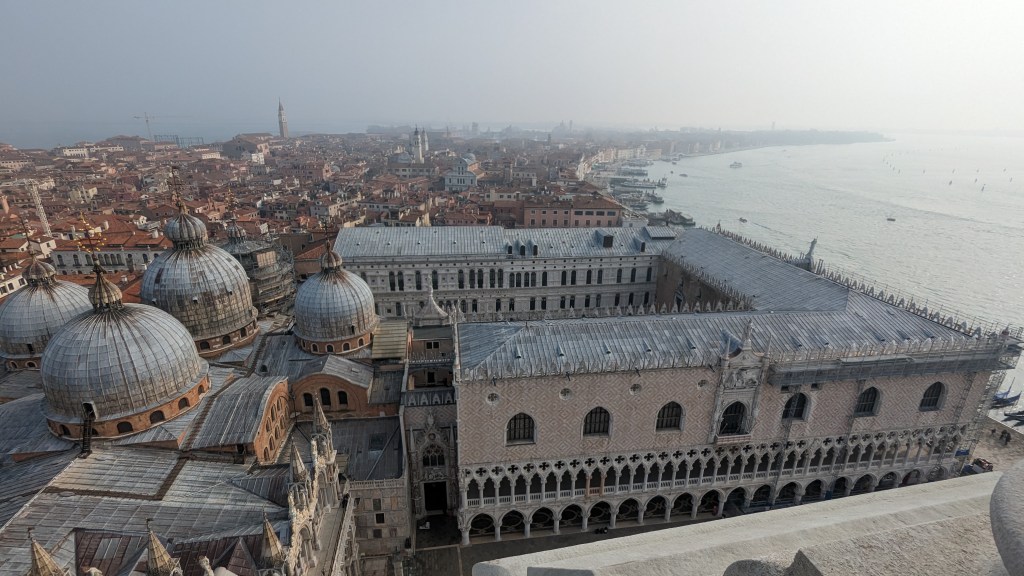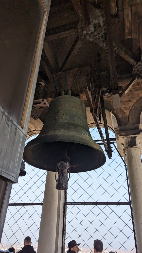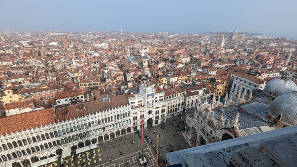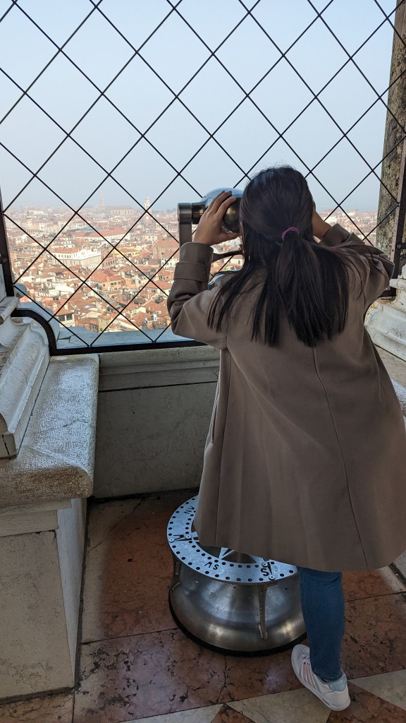 鐘樓位於道奇宮和聖馬克大教堂旁邊,如果時間允許,導遊也推薦入內參觀聖馬克大教堂,裡面有很美的馬賽克磚製成的圖像,場面非常壯觀,每次經過都至少200人在排隊,票價也不便宜,我們就捨棄入內參觀,轉到隔壁鐘樓去登頂,登頂門票10歐,相較聖馬克大教堂便宜很多。因威尼斯有建築限高,甚至建築外觀有損壞要維修都得經過申請,登頂後可以一覽威尼斯島全貌,磚紅色屋頂的房子整齊排列,各個教堂與建築物高聳佇立莊嚴的樣貌,海與湛藍的天空連成一線,超級漂亮,可惜有窗戶擋住視線,無法360度眺望。另外,頂樓也提供望遠鏡與紀念幣製作,價錢都是1歐。