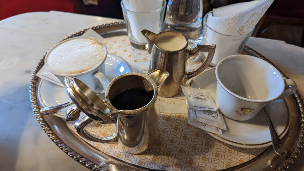 我們隨意找了靠窗的位置,點了兩杯咖啡,悠哉欣賞人來人往的景象,題外話,我平時很少喝咖啡,為了調時差我每天早餐都會喝卡布奇諾或濃縮咖啡,很意外地我很能適應義大利的咖啡,都不會心悸或不適,然後因為我是咖啡盲,所以我覺得喝起來跟飯店早餐沒什麼差別哈哈,沒有音樂還被收音樂費,感覺有點被當盤子。經與領隊確認,結帳是直接將現金放在盤子上,就可以直接走人(不怕被偷嗎?),服務生看我們直接走出去也沒說什麼,只能說是個特別的體驗。