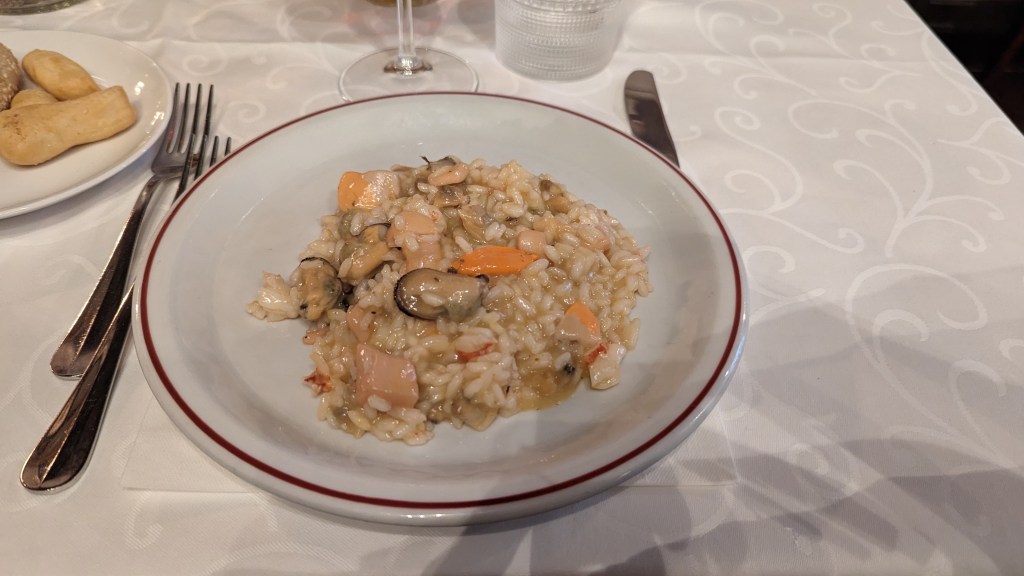 本餐為三道式餐點,入座後一樣有麵包,第一道為海鮮燉飯,第二道為魚排佐蘑菇花椰菜,第三道為檸檬冰淇淋。員工花了15分鐘在統計我們酒水(我們團24人),有拿筆抄,反覆問好幾次誰是什麼飲料,但最後還是沒有記住,前面到底是在忙什麼啦哈哈哈,這在台灣應該就會被罵翻和客訴,只能說來義大利就是要體驗這種隨和慢活的感覺。