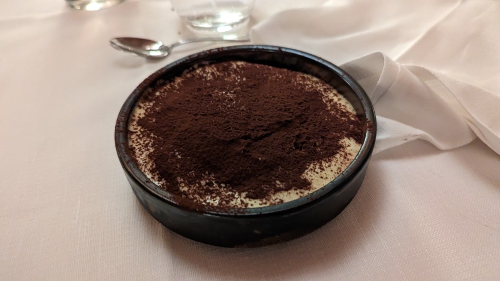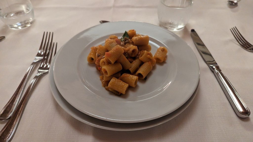又是三道式餐點,入座後提供麵包,第一道為茄汁筆管義大利麵、第二道是烤雞,第三道為提拉米蘇。抵達飯店放行李後,晚餐約為20:00開始,第一道調味還可以,只是義大利人喜歡吃硬的麵體,對我來說麵芯有點太硬很像沒熟,烤雞的尺寸偏小,讓我一直聯想到鵪鶉或鴿子,皮上還有毛,吃了一口覺得很乾柴,就丟給伴侶,只吃旁邊的馬鈴薯,因我不擅吃甜食,提拉米蘇吃了兩口也都送給伴侶了。