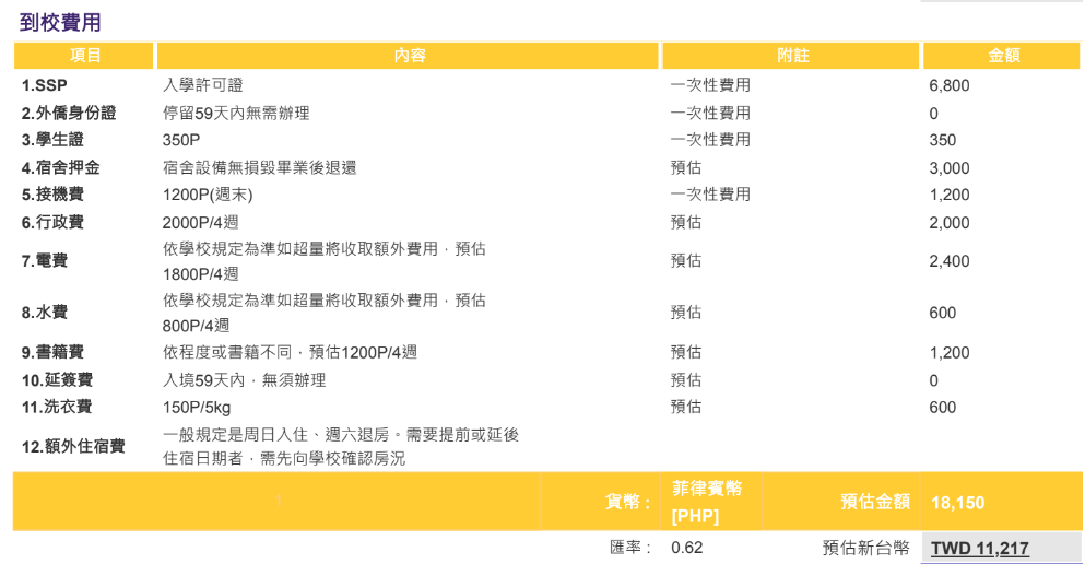 另外報價單會分兩個部分,各家代辦及各家學校在這點皆一致,新飛留的格式上半部為學費與住宿費用,以美金計價,上半部即是要直接支付給代辦的總金額;下半部為入學後預估支付的費用,以披索計價,最好準備至少超過下半部總額的同等美金。