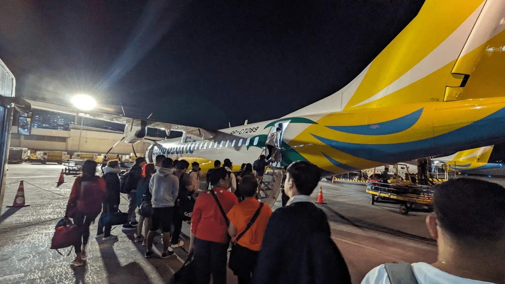 終於等到正確的登機門宣布後,順利的通過了登機門,接著搭乘接駁車前往搭飛機。因為搭乘時間只有一個小時,所以伴侶就沒有換位置,我很幸運坐到靠窗的位置,因為天氣很好,飛機上的景色很不錯,菲律賓山水並立,從上俯瞰下去真的有夠水,但我隔壁的年輕菲律賓小哥,會像我爸一樣,音量調到最大聲看影片不顧他人眼光,最後還唱起歌來(?),由於前後左右都是他的親友,臭俗辣的我就只好入境隨俗了。