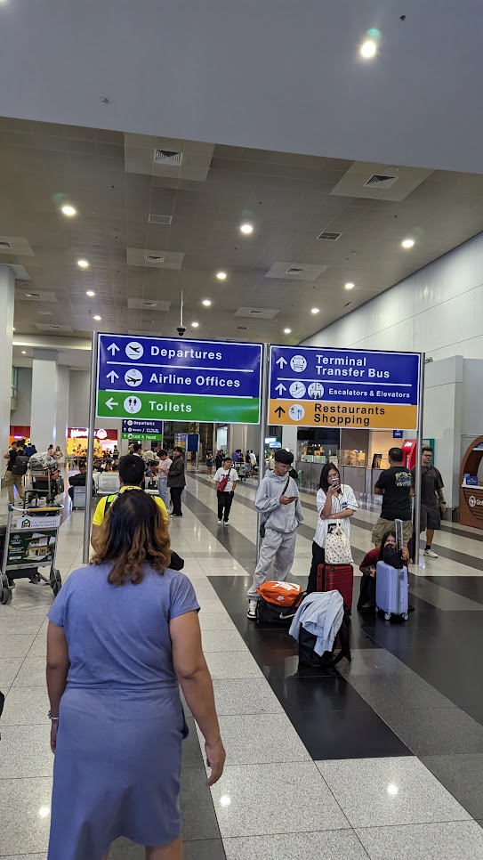 因前幾次在菲律賓搭飛機的經驗,要嘛海關刁難,要嘛一直換登機門,擔心會遇到什麼變卦,因此我提前進行出境手續,進去國外線的第一關就是海關,本來想說上次被女海關刁難很生氣,想要扳回一城,順便測試自己英文能力是否有進步,結果排到一半就被工作人員指引,跟著一對夫妻與小孩走到隔壁棚,連海關人員都沒有,然後就直接順暢的通過安檢了(可能出境沒有這麼嚴格?)。