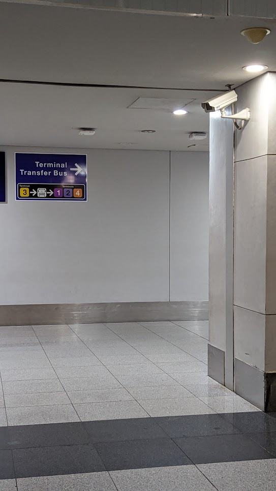 順利完成安檢後接著會進到一個等候區,這邊完全沒有任何電子或書寫看板顯示出發時間,只能跟站務人員詢問預計何時發車,他會主動跟旅客宣布公車已到站,主要公車有正反兩條路線,會依序跑過每個航廈,差別是轉乘時間先到後到而已,在Google map上可以查到不太正確的路線圖。等了快二十分鐘後,公車終於抵達,依序上車後就可以得到一趟免費的機場巡禮,沿路至少看了四五十架飛機,還經過了兩三架軍用迷彩飛機,還蠻有趣的,大概搭乘20-25分鐘後抵達了第四航廈,一路上時速大約只有20公里。