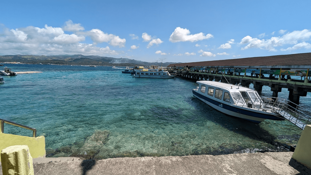 上船後工作人員通知我們,長灘島上的渡船頭會有另一組人接待我們,就認他們家公司制服即可。搭船時間大約15分鐘,大概像到旗津一樣很快就抵達,下船後馬上就看到清澈的海水,海裡的魚一清二楚,突然忐忑的心情也都被拋諸腦後。接著又是等待包車接送,然後上車,30分鐘後即直達旅店門口。