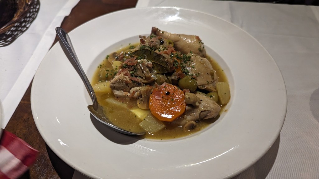 海鮮燉飯(Paella de mariscos)超級優秀必點,超大份!推薦人多一起來分,海鮮料多,蝦子新鮮輕輕拔尾巴就彈出來,整體口味鹹香適中,然後中等的份量就超多,兩個人來吃差不多。馬鈴薯烘蛋(Tortilla de patatas)還不錯,份量也是很足,小鳥胃的都一份可以當一個人的正餐了。最後點了一道蒜香雞肉(Pollo al ajillo),一共是半雞的樣子,腿部入口即化超級好吃,不過雞胸部分就有點柴,不太喜歡,佐很多的馬鈴薯,份量也是挺不錯的。對了,餐前還會另外送來切好的長棍麵包以及橄欖油配紅醋醬,很好吃不過份量太多啦,最後沒有吃完的對餐廳太抱歉了,此生如果還有機會來,會再來光顧。