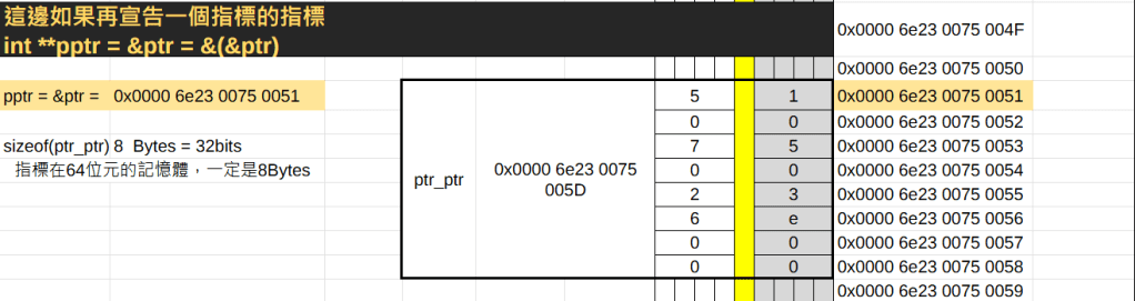 這邊如果再宣告一個指標的指標 int **pptr = &ptr = &(&ptr)