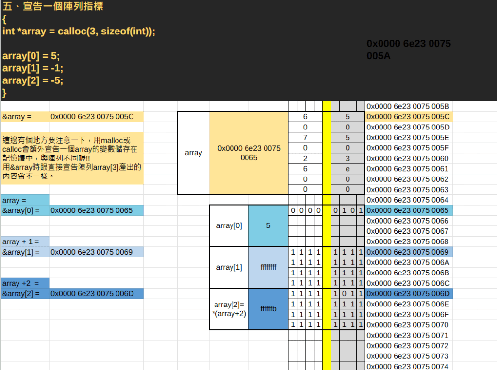 對了,文章內僅截圖基本內容,進入試算表內還有第二個分頁「多維陣列跟malloc的實際案例」喔!