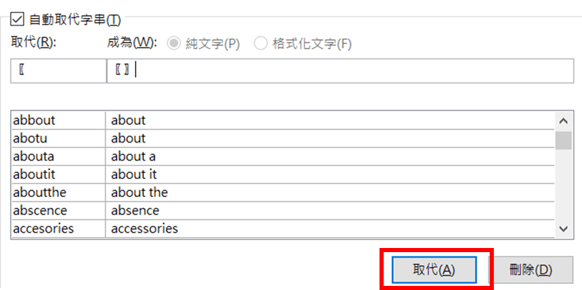 接著找到中間處有個"自動取代字串",預設應該是打勾的,如果沒有打勾,請勾選。
