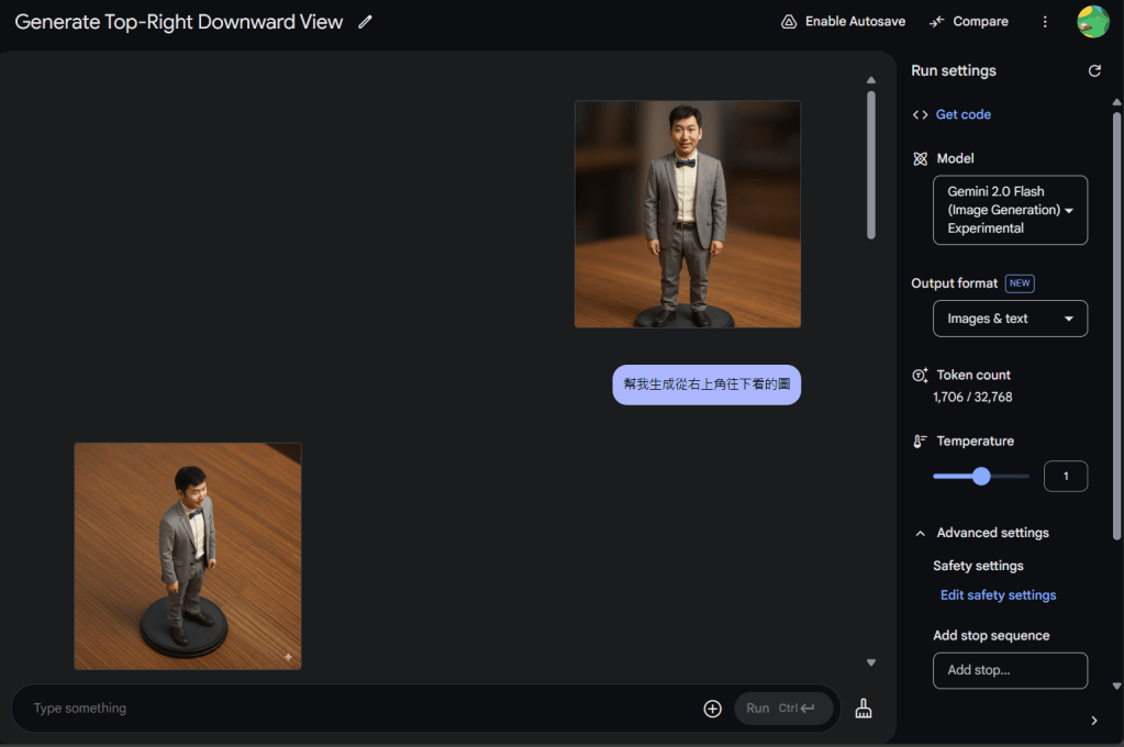 還沒完,為了讓公仔更逼真,我決定要再生成幾張不同方向的照片,但GPT生成圖片近期被限制免費的用量了,我們改將成品圖丟到Google AI Stodio服務,用Gimini模型來幫我們完成最後的圖片輸出。
