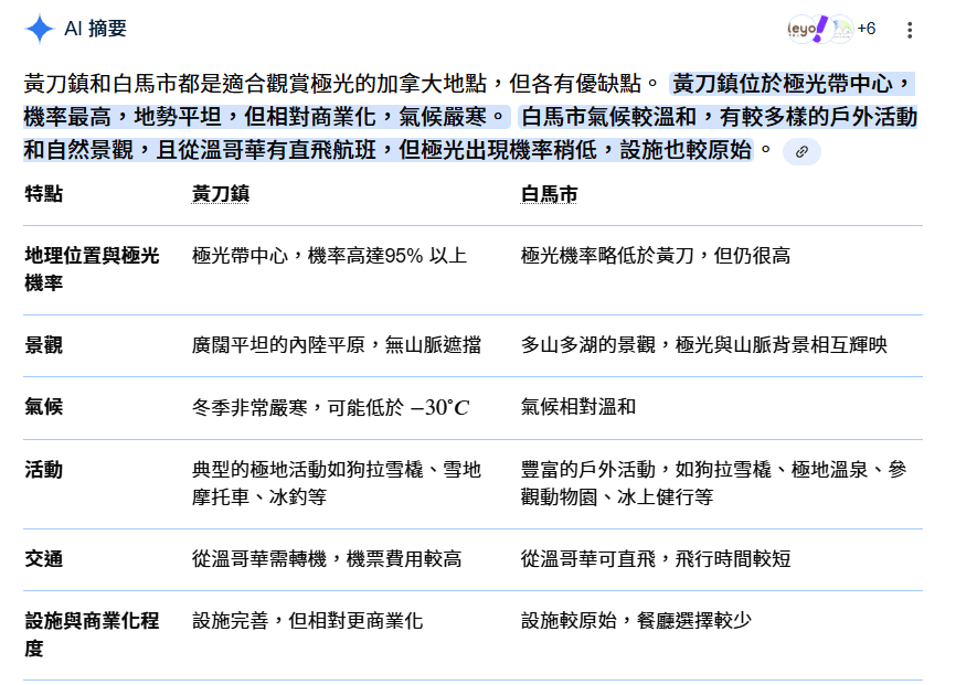 加拿大看極光選擇主要有黃刀鎮、白馬鎮,前者看極光的機率稍微高一點,相對商業化程度高,機票與價格也高不少;後者除了極光外,自然景觀與溫泉在網路評論上也是一絕(可看AI整理)。