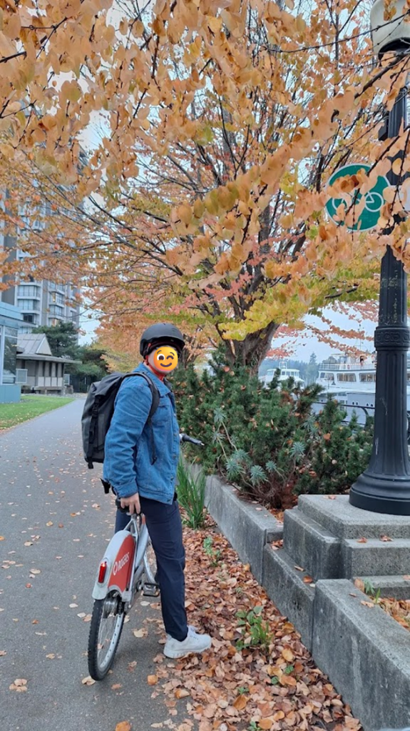 在加拿大騎腳踏車需要戴安全帽,所以車籃照理來說會放一頂帽子,我們當時租借的地方大約有六台車,卻只有一台有帽子,聰明的我們騎到下一個租借站去拿別人的帽子,解決了可能被罰錢的困擾。