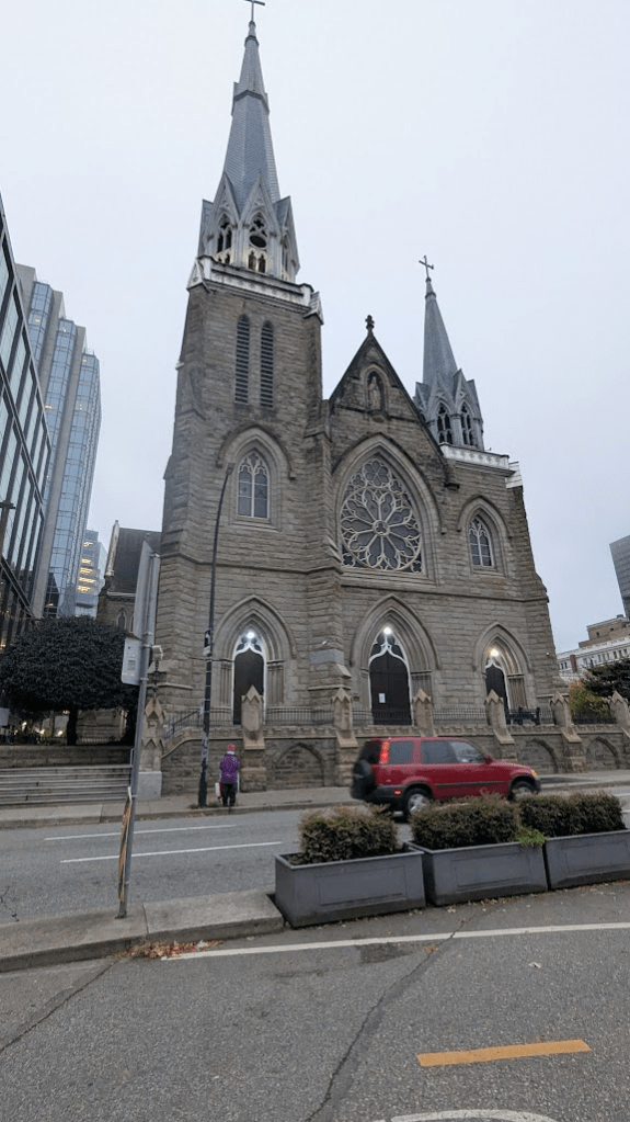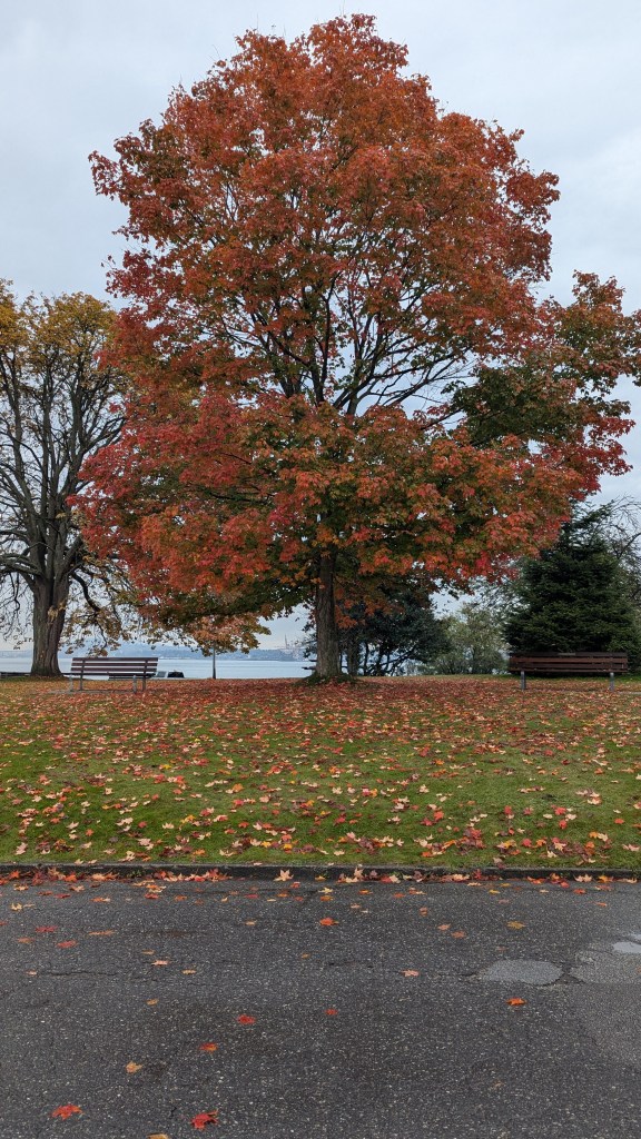 10月份溫哥華日出大多落在七點半左右,為了把握早上出遊時間,我們很早就起床(或沒睡),七點初就離開住宿地,開始了今日的冒險旅程。凌晨的溫哥華起霧飄著細雨,週邊沒有什麼人,少數街友睡在屋簷角落躲避風雨,我們一邊讚嘆溫哥華的地板實在乾淨,即便路上沒有車子,駕駛也非常遵守交通規則;一邊對著週邊的樹木感到疑惑,說好的一大片紅色艷麗的加拿大楓葉景觀在哪兒XD?