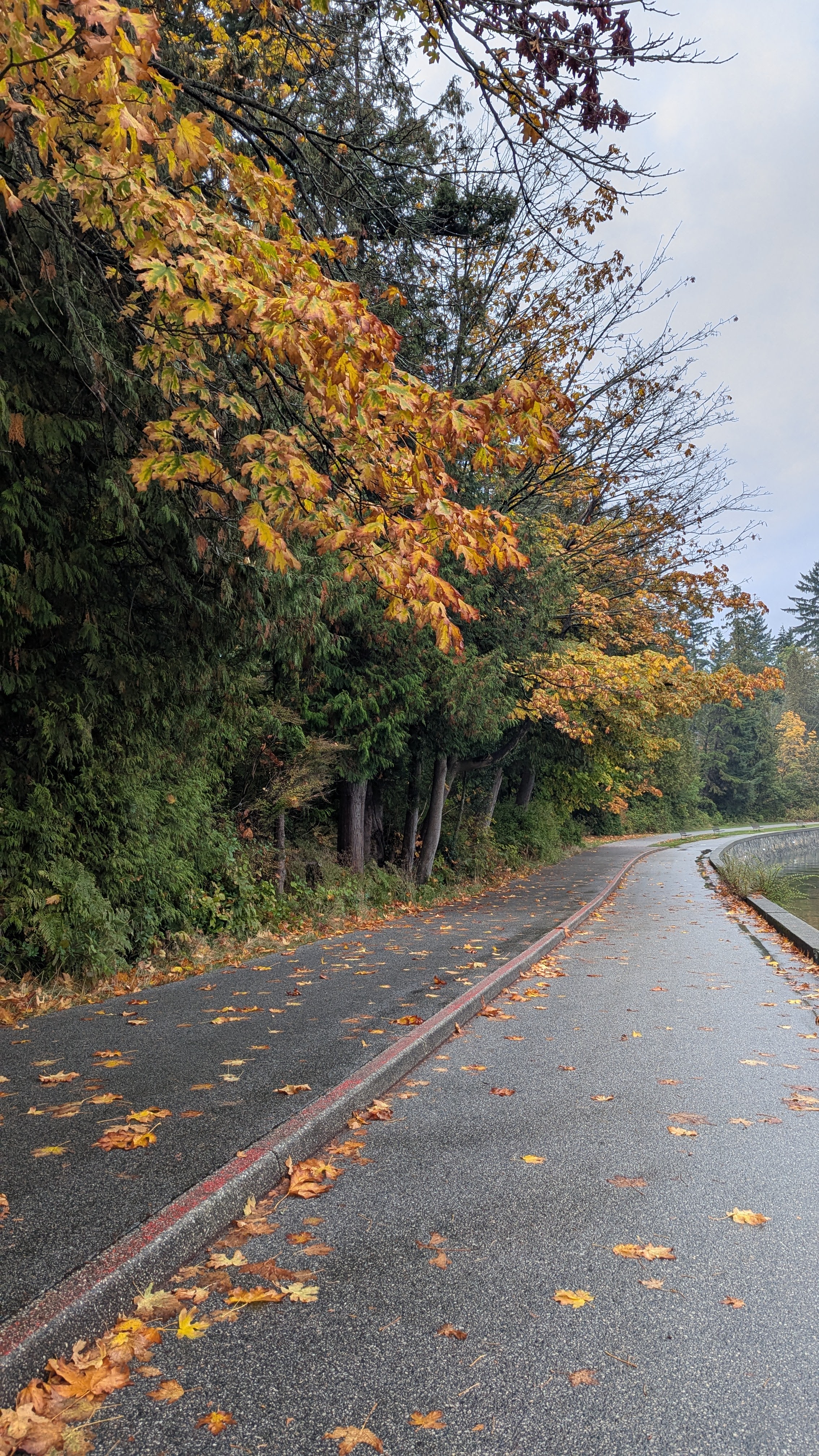 天氣10度,騎著騎著雨越下越大,我們看著周邊老外穿著薄外套怡然自得的樣子,想著我們穿得比他們厚應該可以撐過去,嘴硬的我們就這樣繼續騎,最終因為雨太大遮蔽視線,也顧不得看沿途風景狂飆,結果輕便雨衣破了、衣服和頭髮都濕透,只好騎到最近的還車點歸還車輛,在附近的等車點叫uber,回家換衣服。我們沒能環完並好好欣賞一圈史丹利公園,含淚跟馬車與港景說再見,堪稱此行最大的遺憾,之後若有機會再訪加拿大,一定會再回訪。