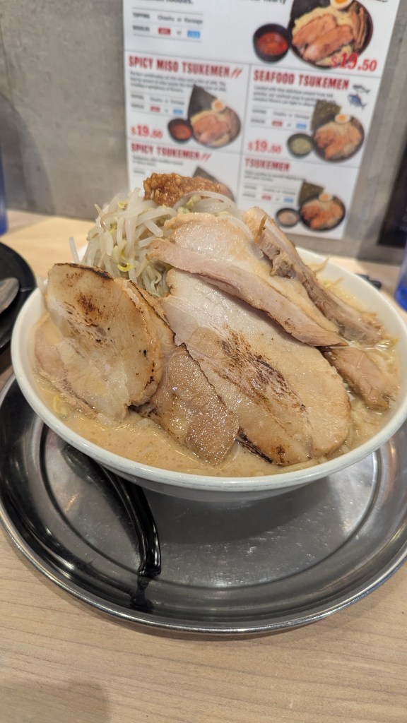 二郎豚骨湯頭被豆芽菜稀釋,身為重度拉麵成癮者,只能說湯不夠鹹,蒜頭不夠多,但肉大片不柴非常好吃。因為我們不會日文,英文也是幼稚園程度,不知道是否可客製化,有興趣的朋友可以再問店員。