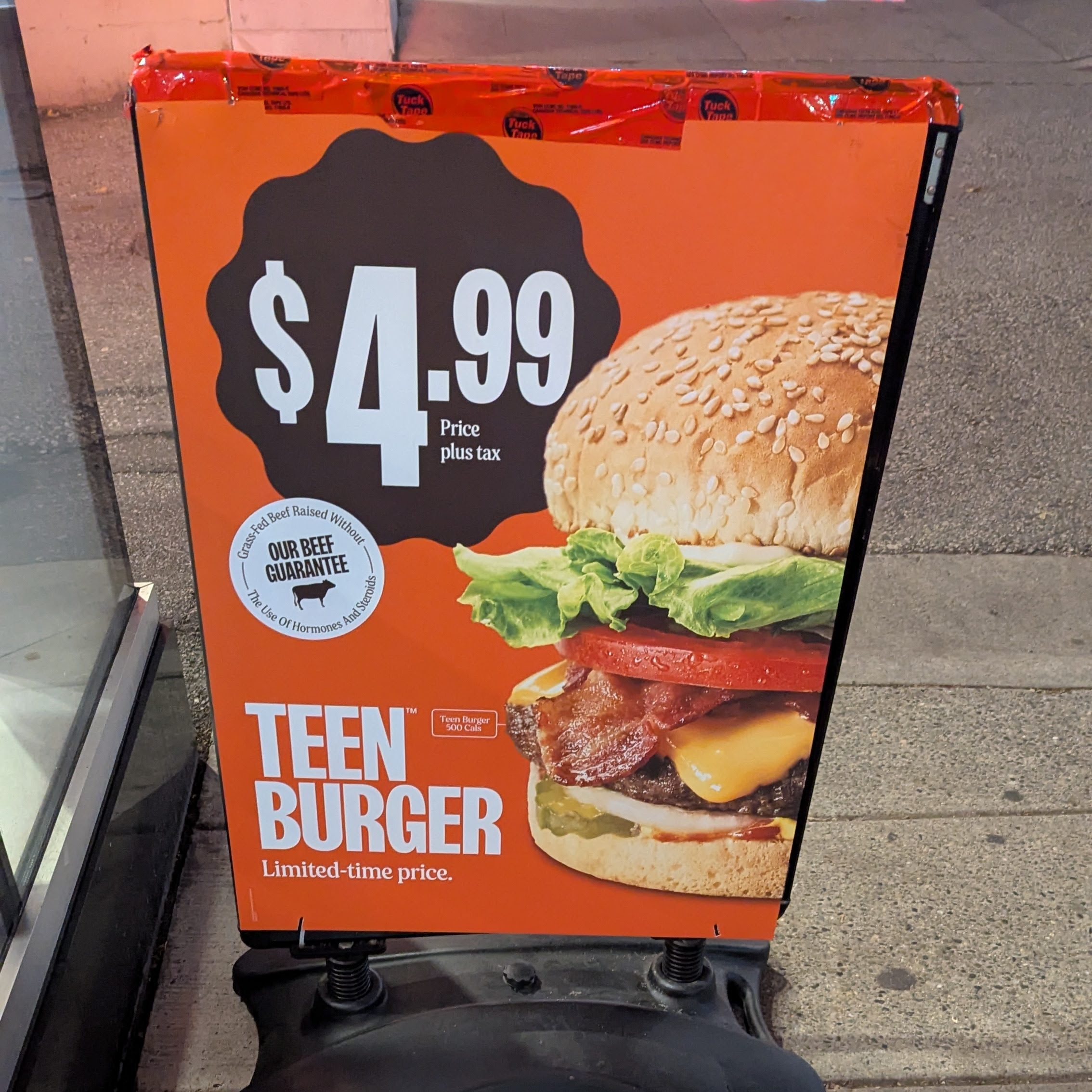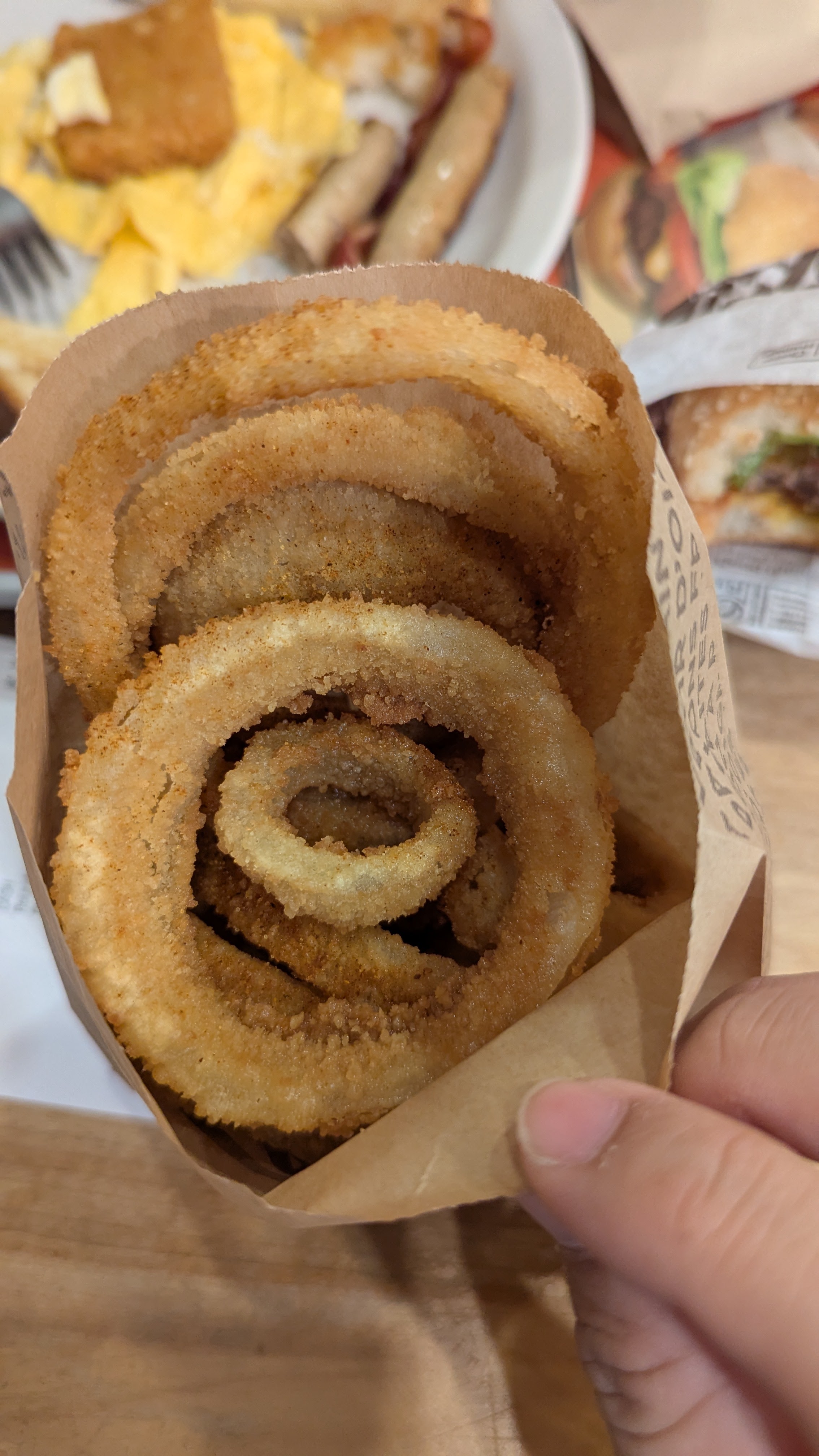這是第一次正面與老美對決點餐,我們沒有太多想法,就點了特價的Teen burger(牛肉)、all-canadian special(內容物有薯餅培根烤土司蛋)、ring(洋蔥圈)、breakfast wrap(培根蛋捲餅)。店員口音捲舌快速,好險耐心的店員放慢速度講了兩次,才聽出來是要問蛋的烹飪方式以及是白吐司還是全麥土司。早餐盤端出來的時候嚇一大跳,大小應該是台灣的兩倍,食物就是可以想像的味道,價格還算親民,洋蔥圈不愧是招牌酥脆多汁,捲餅CP值不高不推薦點,最後我們直接外帶一半裝便當盒當午餐。