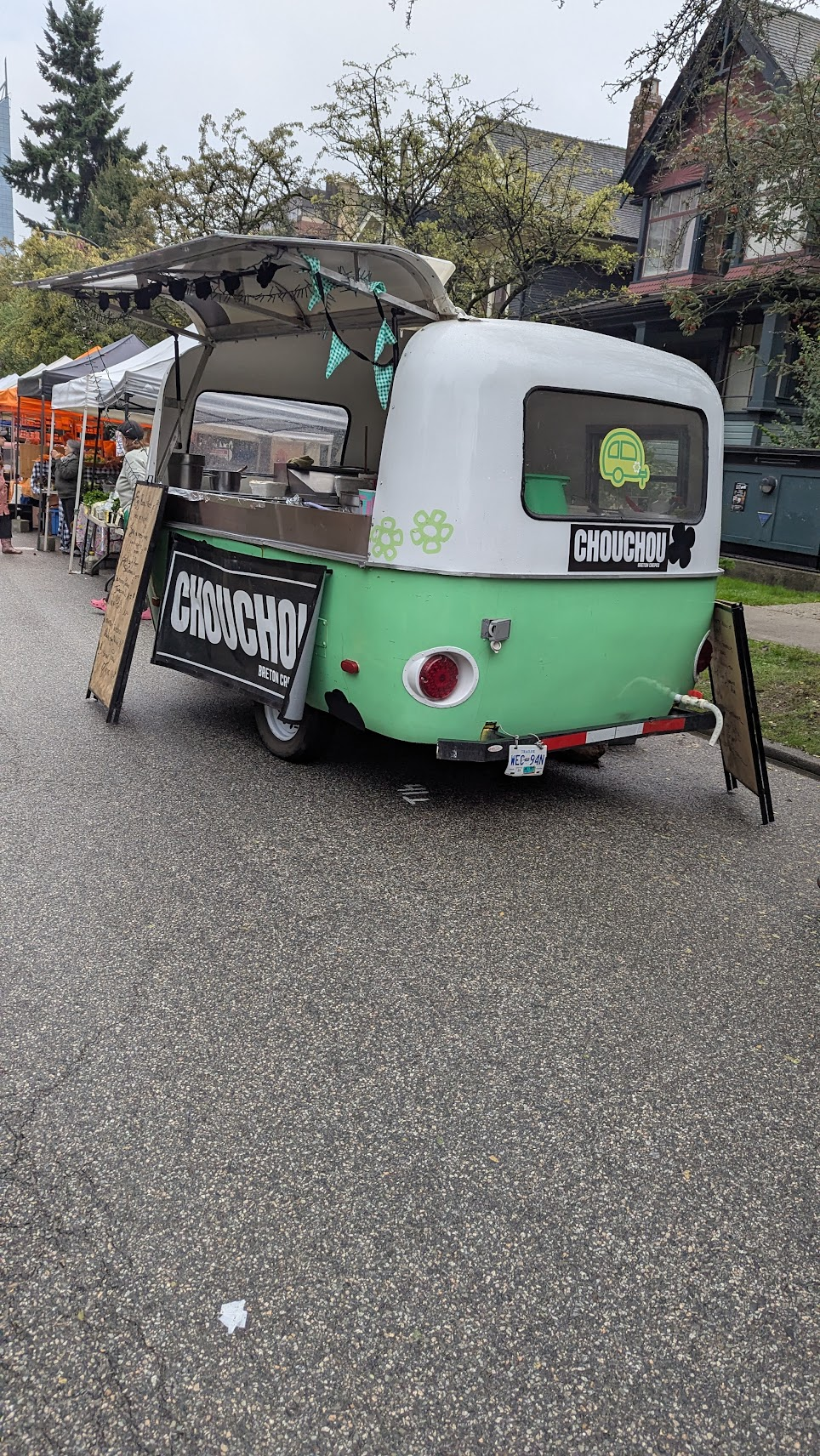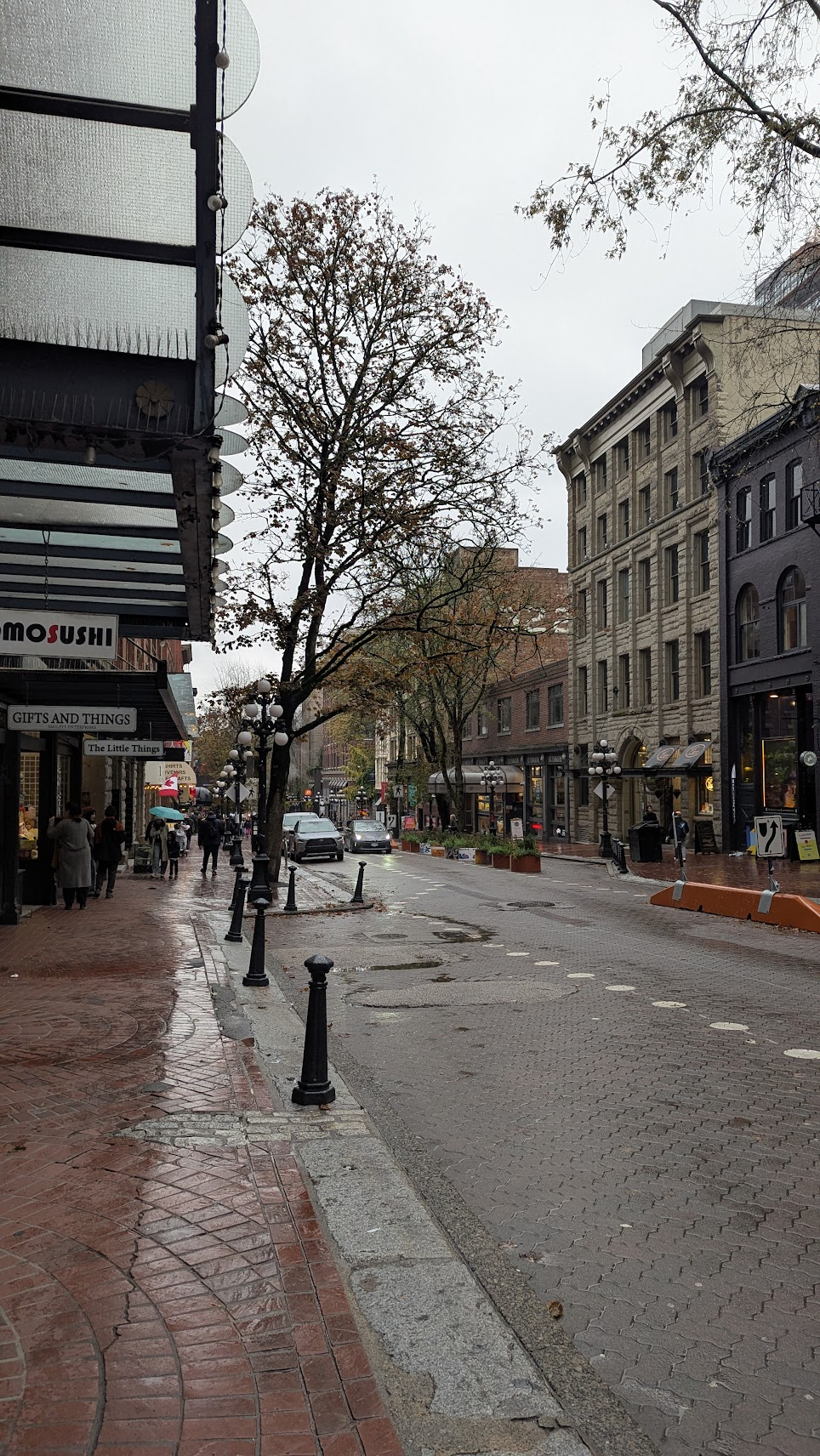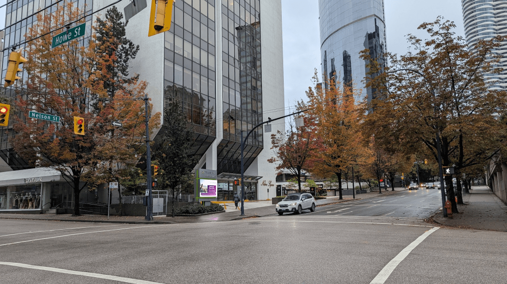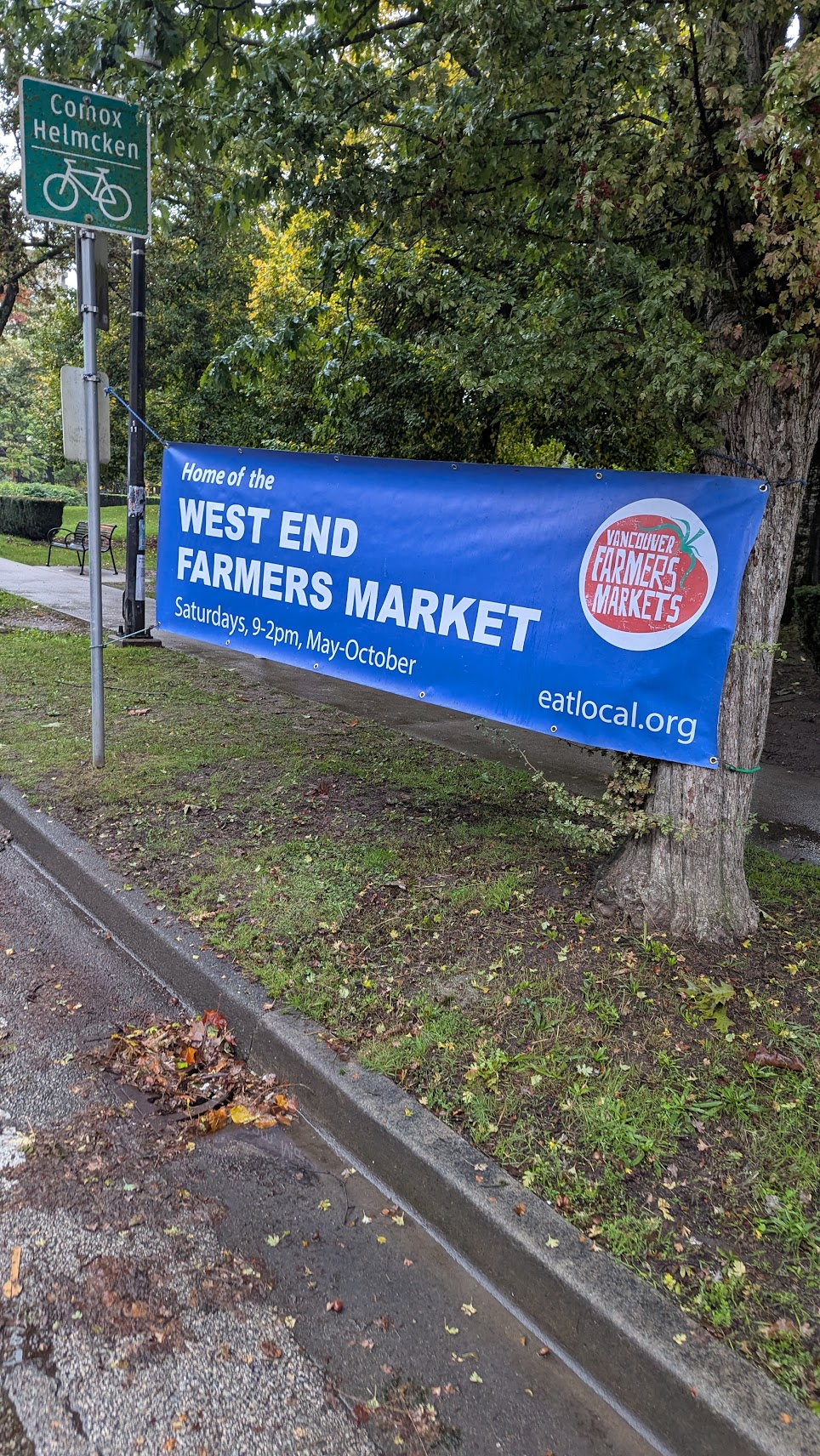 西區農夫市場距離住宿步行約20分,我們大約8:30出門,可能因為是假日,路上並沒有太多車輛,只有少數遛狗的行人,就這樣邊散步邊欣賞溫哥華街景,當時的氣溫落在9度,依舊細雨綿綿,盼不到絢爛如霞的楓葉林,只有躺臥在地板奄奄一息的葉子屍體,但道路是真的乾淨整齊,標線也很清楚,整體氛圍是很舒服的。