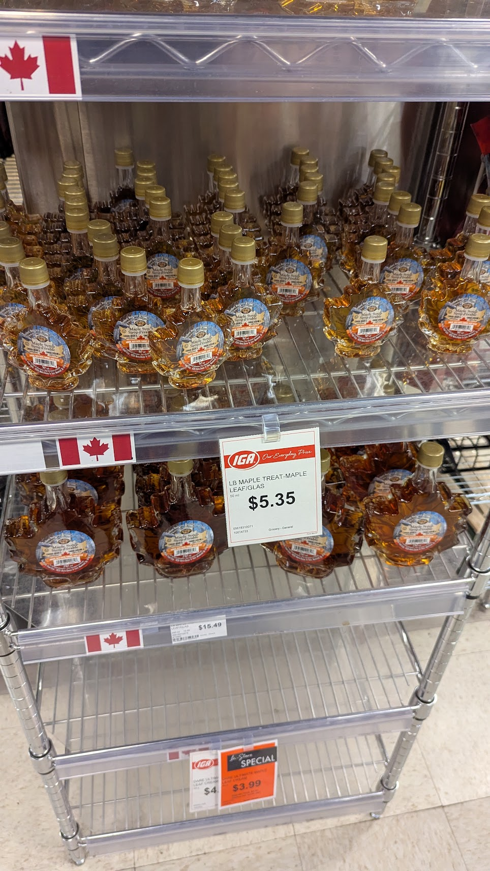 IGA算是當地超市,營業時間長,很早就開店,在加拿大有多間分店,以農場品與肉類品質高聞名,規模比全聯還大,生鮮熟食選擇還算豐富,缺點是價格稍高。這邊也有賣常見的伴手禮楓葉餅、楓糖漿、楓葉茶等,不過我們打算下午去煤氣鎮再買,所以只有拍個照紀錄一下。
