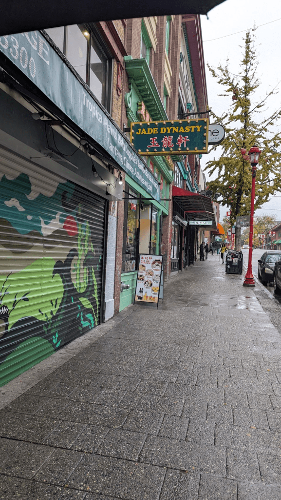 溫哥華治安最差最危險的街E. Hastings St就位在煤氣鎮步行約10分鐘距離,所以在安排住宿與行程時有刻意迴避,並把煤氣鎮景點挪至早上。然而,計畫趕不上變化,人在他鄉突然想吃熱食,爬文發現加拿大早期有許多香港華僑移民至中國城,在加拿大吃港式飲茶反而比較正統,就這樣一股腦的往中國城跑了(其實也是僥倖心態,離那條街還隔一條路應該還好?)。