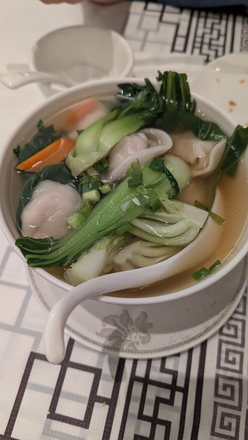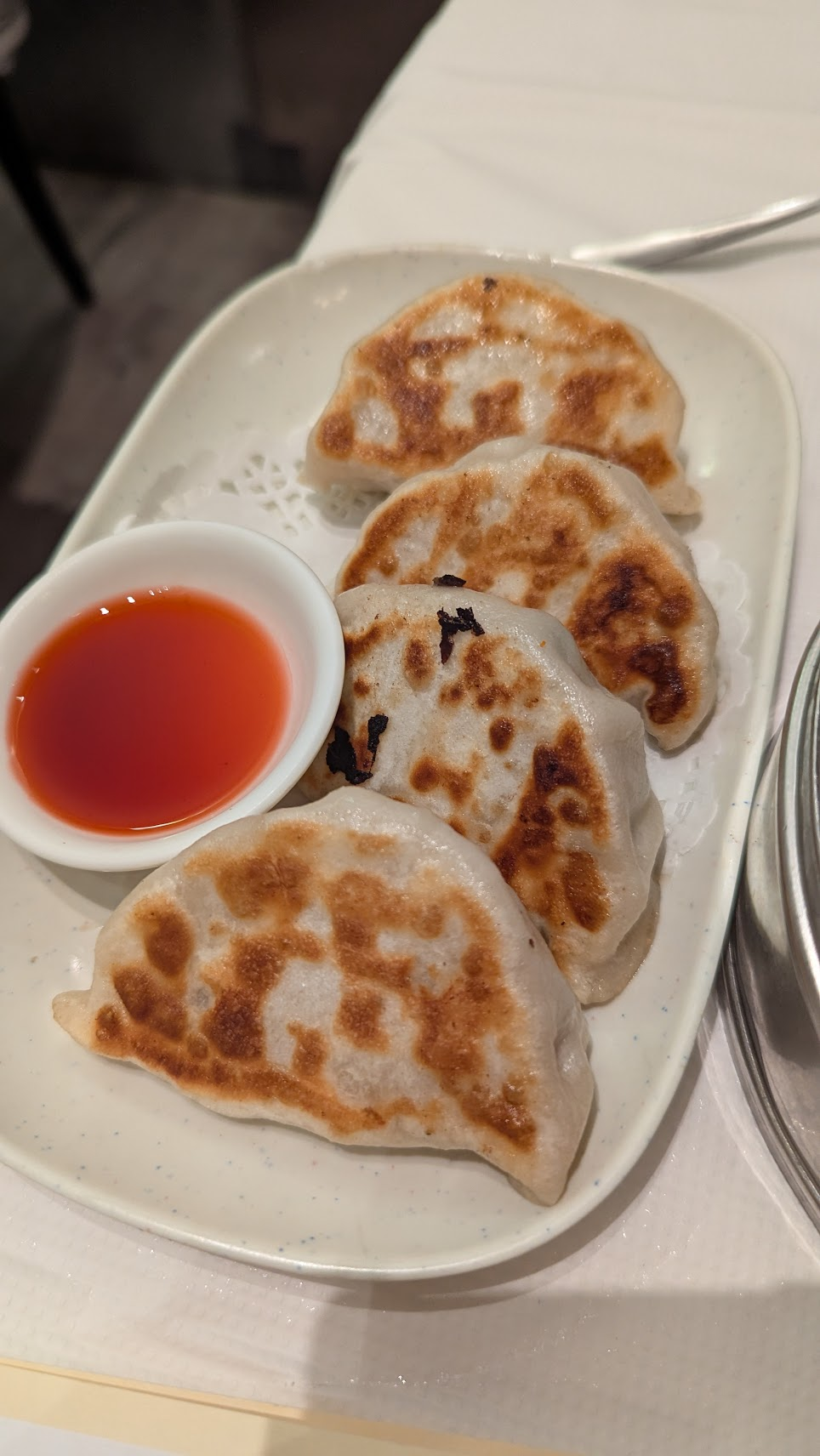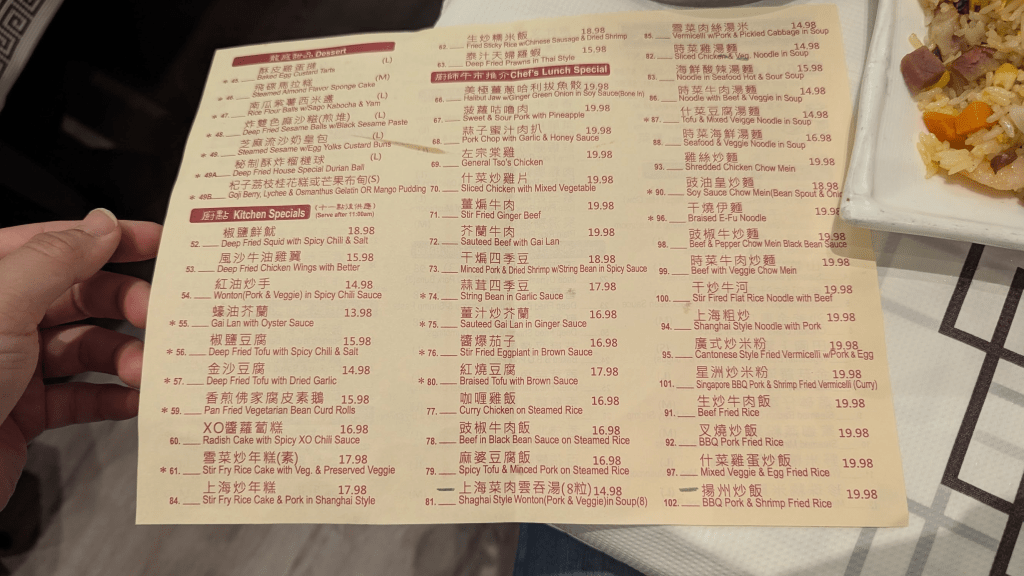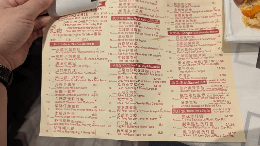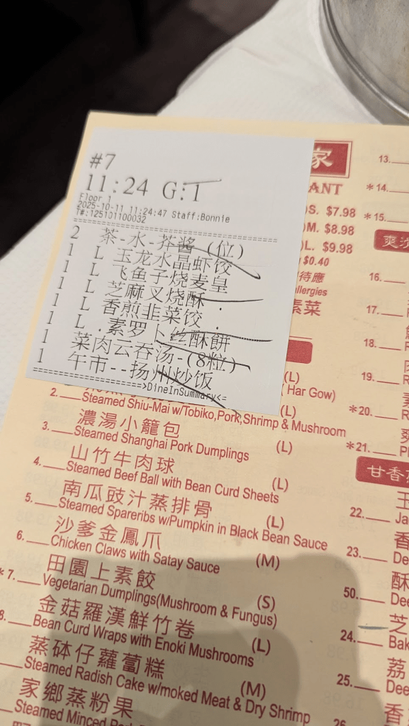 進到店家後,工作人員都挺溫柔的(只是嗓門比較大聲),沒有評論說的這麼恐怖,除了港點外,這間也有賣主食、熱炒類,這次點了水晶蝦餃(4入)、飛魚子燒賣皇(4入)、芝麻叉燒酥(6入)、韭菜餃(4入)、素蘿蔔絲餅、雲吞湯、揚州炒飯,含小費花費104加幣(約台幣2,352元)。