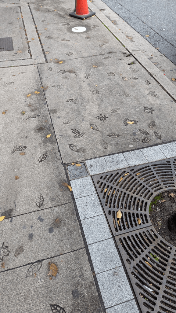 這時突然發現地板有玄機,原本還以為是類似狗腳印的水泥地,沒想到是樹葉的裝置藝術