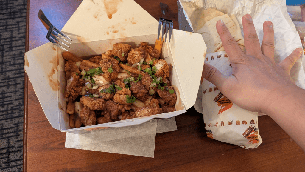 回家打開嚇死,一如既往的分量很多,整盒Poutine的炸雞像不用錢般灑滿,可惜薯條已經被我們悶爛。雞肉捲更是大到兩人吃不完,裡面有很多蔬菜和香料,口味爽口,連我不喜歡吃甜醬的人都可以接受。如果有時間和捨得花小費,推薦一定要現場內用吃。