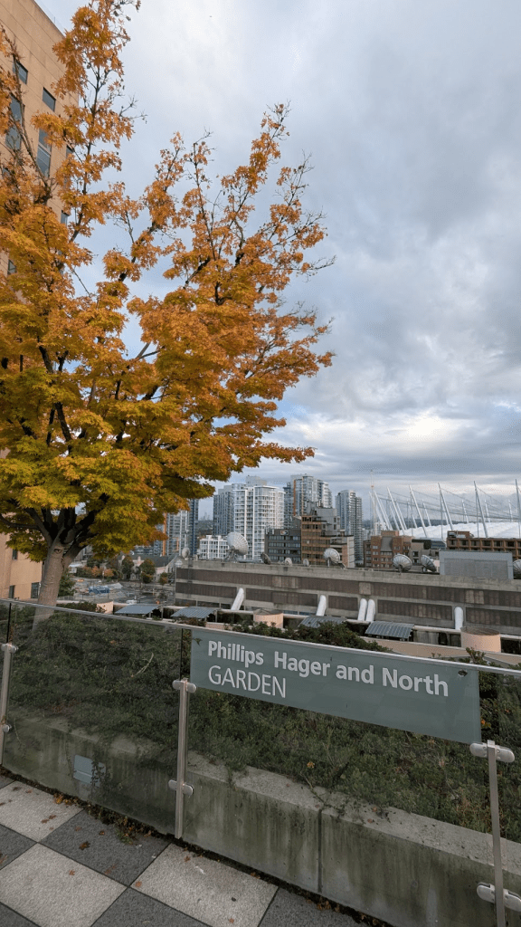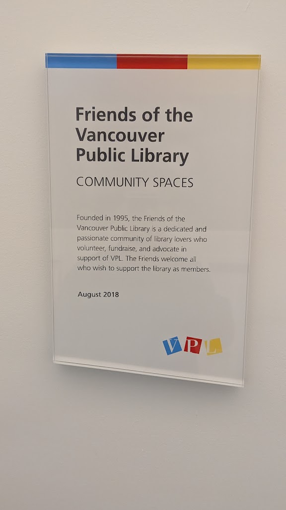 自住宿地步行約兩分鐘,圖書館外也有腳踏車租借站,圖書館建築物風格類似羅馬競技場,挑高樑柱與圓拱,四處都是大片玻璃窗,採光明亮空曠,外觀非常漂亮。走進建築物內,旁有幾間小商店販賣伴手禮、咖啡、甜點等;溫哥華圖書館內有好幾層樓,藏書非常豐富,也有閱覽室、會議室、兒童圖書館(有很多教具桌遊)等空間可以使用,我還找到一區有中文的霸道言情小說可以看,櫃檯也有放一些手冊文宣供民眾索取,身為社工看到這些東西多少還是有點職業病。