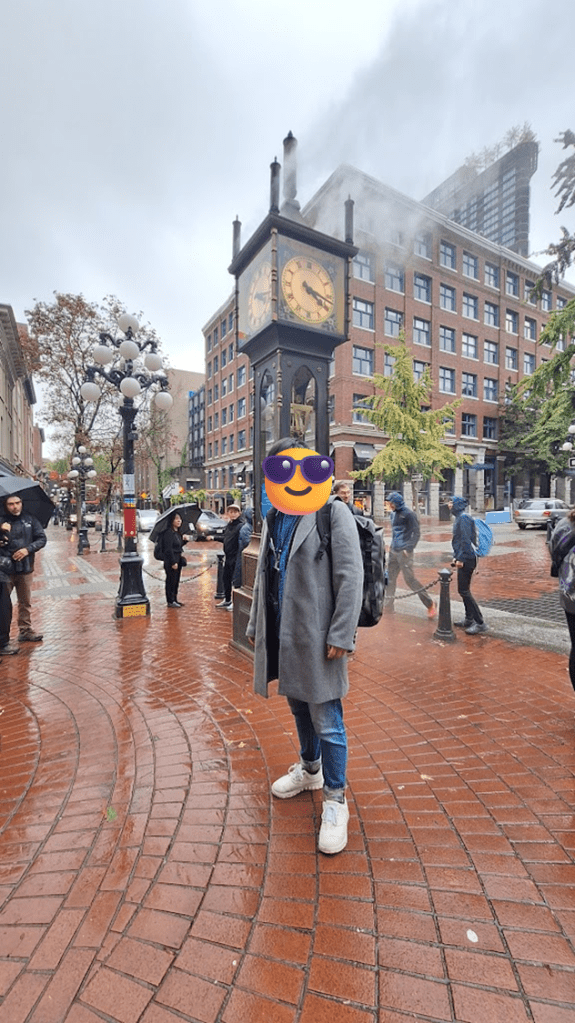 煤氣鎮街道非常歐式,四周都是維多利亞建築,非常漂亮,蒸汽鐘本人也非常吸睛,雖叫蒸氣鐘,但現在主要仰賴電力發電,僅有汽笛聲是蒸汽運作,每15分鐘左右會鳴笛唱歌,蒸汽會在空中凝聚又散開,宛如身在電影場景中。小插曲是現場放了一張藍色告示牌說設備維護中,我們原本還以為聽不到鳴笛了,最後發現僅僅是時鐘有誤,不影響觀賞。