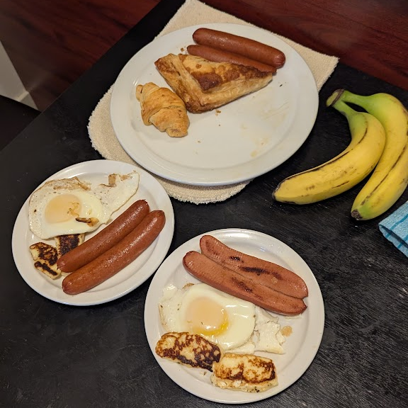 因前一晚極光旅程半夜兩點多才回到飯店,梳洗後入睡已近三點半,早上耍廢到10點多,簡單烤一下昨天去超市買的熱狗、麵包、起司再煎顆蛋,配上昨日司機大叔的香蕉,照片記錄11:28分開始吃早餐。