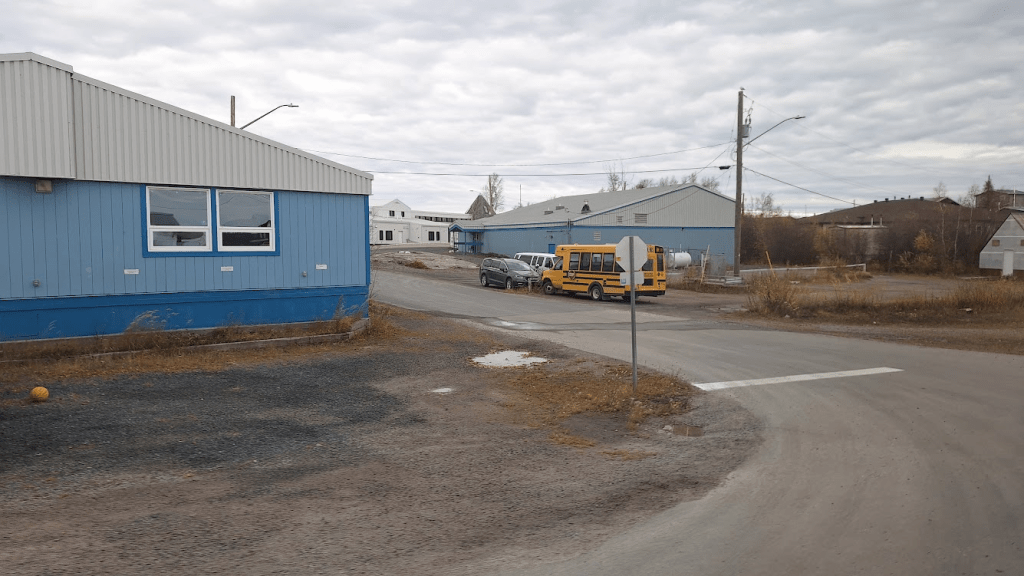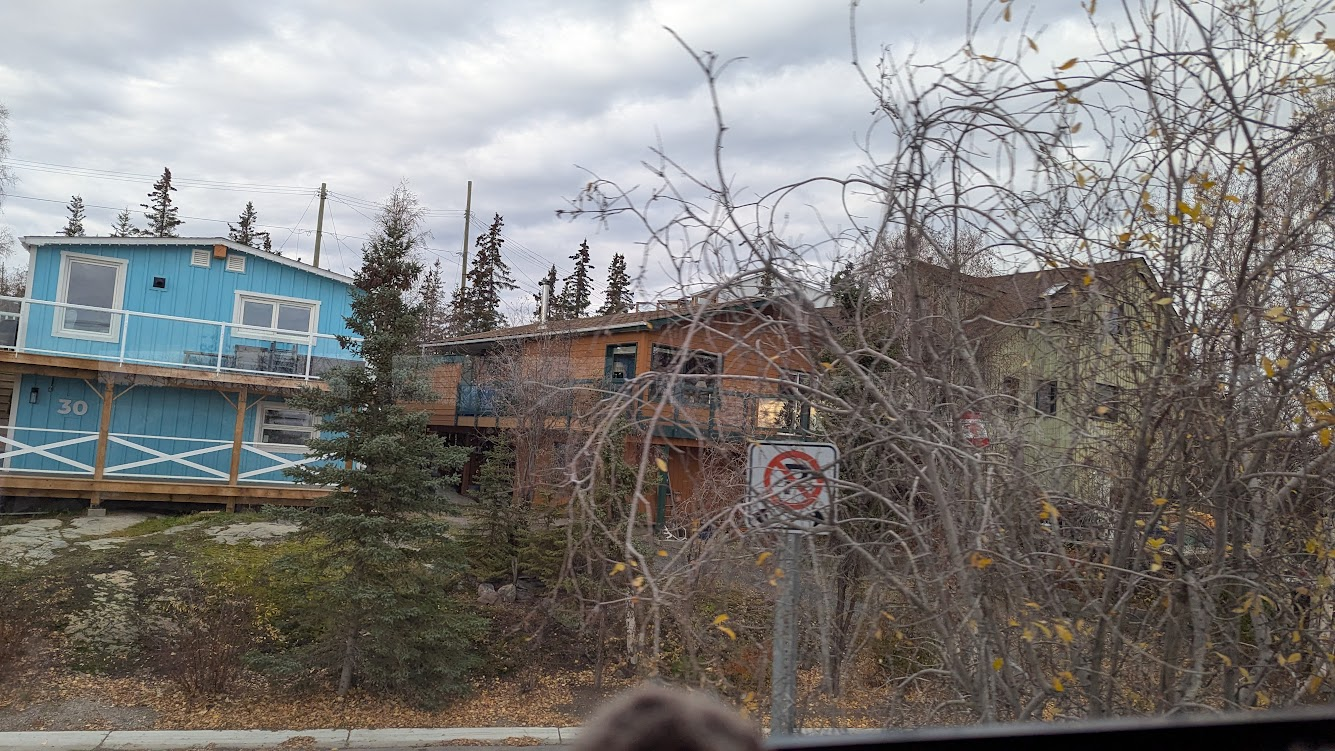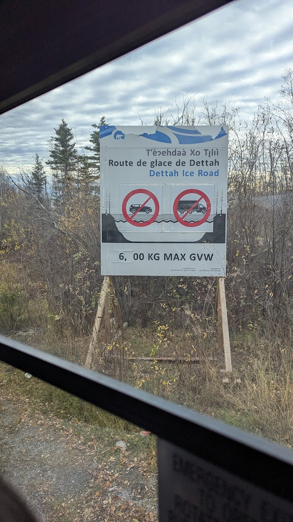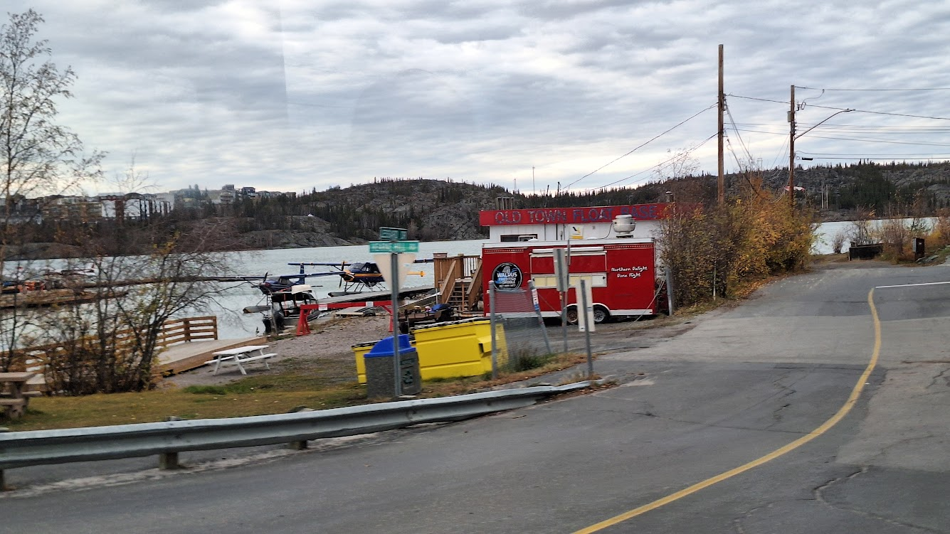 前往原住民保留區前路過了藍白建築物的自來水廠,嚮導補充說明,黃刀鎮位於凍土區,除了植被稀疏外,早期建造房屋、安裝管線、開發道路等都非常困難,因此舊城區是由政府每週配兩次水方式處理,用光了就得自己想辦法處理,門口可開啟紅燈讓大家知道他缺水但不一定會優先處理;新城區目前都有配置管線,就沒有缺水的問題,所以很多飯店後來都建在新城區。