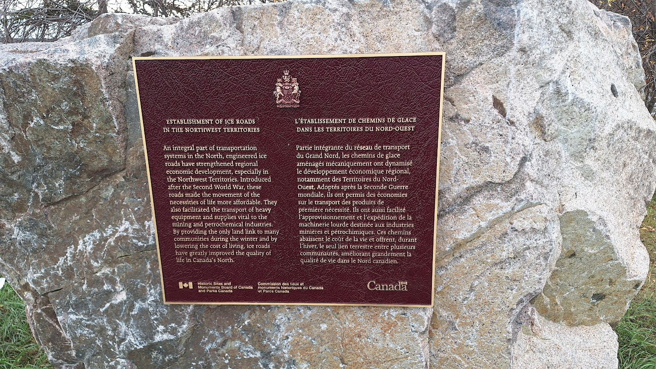 大奴湖是加拿大第二大湖,冬天的時候會全面結冰形成公路,住在另一頭的居民原本可能需要50分鐘通勤,就會縮短成7分鐘。下圖的牌匾敘述了建照冰路的歷史以及如何提升當地居民生活品質的過程。
