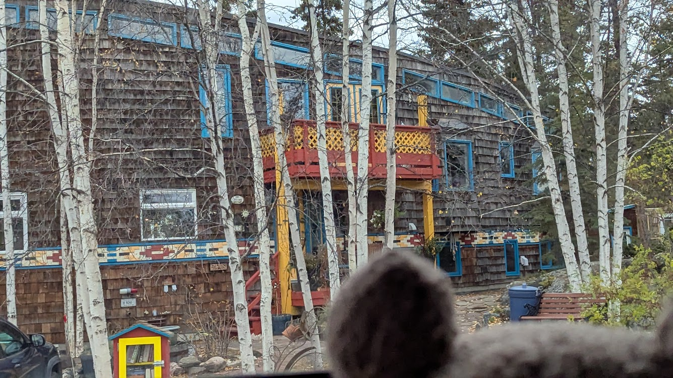 今天有安排星辰之旅極光團附贈的市區導覽活動,集合時間為中午12:05,大廳人數沒有昨晚這麼多和熱絡。新嚮導依舊叫錯我們的名字,聰明的我們主動向前詢問,所以準時出發。不愧是北極圈上且無遮蔽物的地方,即便到了中午時段,仍可以感受到酷寒的風在毆打你的臉龐,如果你是很怕冷的人,來黃刀鎮務必要做好保暖措施以及備足暖暖包。