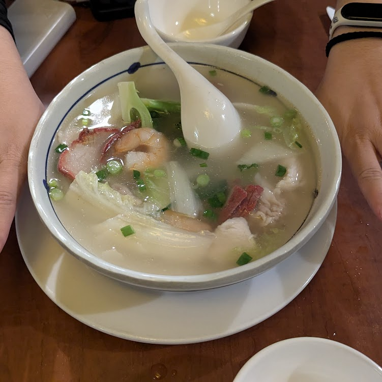 餛飩湯上來後,我們再次想起這裡是北美洲,份量超巨,裡面除了餛飩外也加了許多蔬菜、叉燒,在這種天氣與異鄉能夠吃上這碗,已經非常感動。