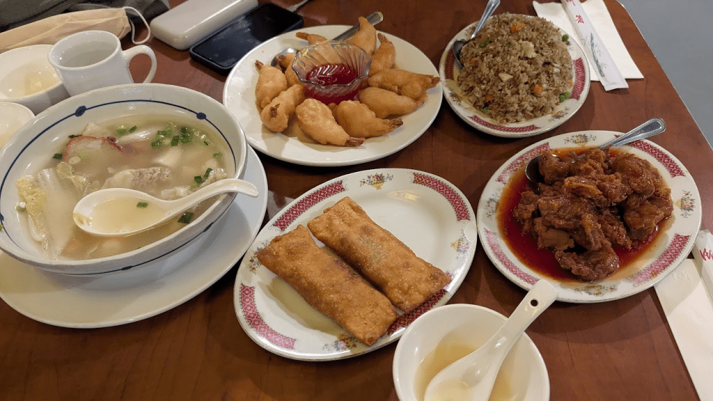 菜上齊後,我們就做好了會打包的心理準備,比手掌還大份的炒飯、10隻麵包胖胖蝦、兩條超粗春捲、目測超過15塊的糖醋肉,兩個人怎麼可能吃得完(最後吃了三餐,早知道就把飯店多廚房的錢省下來吃外面?)。炒飯鍋氣十足,有加三色豆,雞肉很多,如果不喜歡焦與粒粒分明的口感,可能會覺得有點乾硬;炸春捲與麵包蝦是可以想像的味道,需要趁熱吃,放涼容易有油耗味;糖醋肉直接是這間冠軍,沒有因為泡了醬汁而變得軟趴趴,脆中帶點酸甜又不會甜到頭皮發麻,一口接一口,老實說我在台灣還沒有吃過這麼好吃的糖醋肉,現在邊寫邊流口水呢。